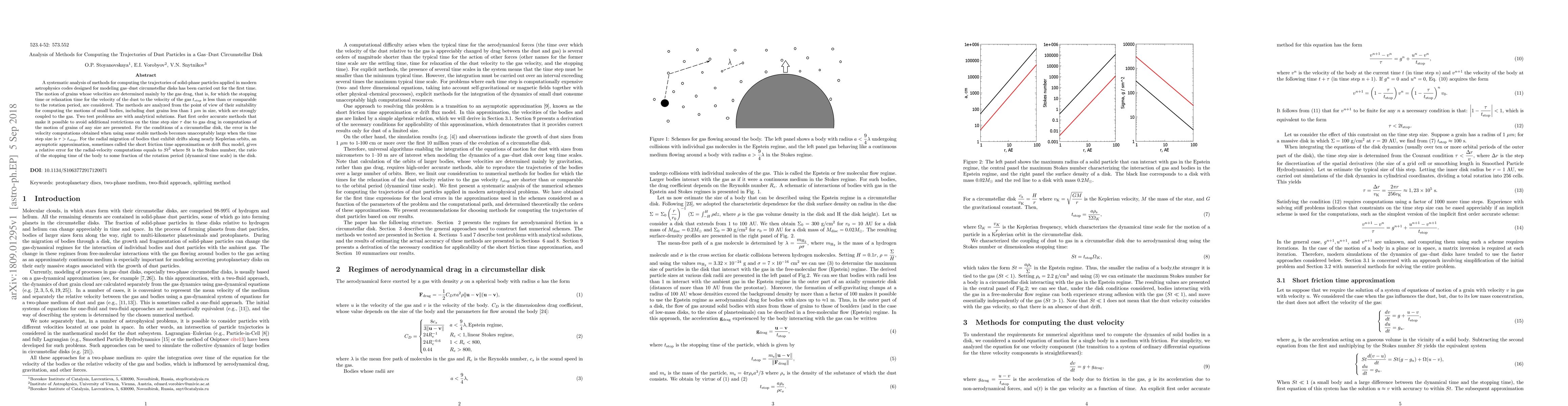 This paper presents a comprehensive analysis of methods used to compute dust particle trajectories in gas-dust circumstellar disks, focusing on small grains (<1 micron) strongly coupled to gas. It introduces fast, first-order accurate methods to bypass time-step restrictions due to gas drag. The study finds that some stable methods yield unacceptable errors in velocity computations for time steps larger than the stopping time, and for radial migration, the short friction time approximation provides a radial velocity error of St^2, where St is the Stokes number.
