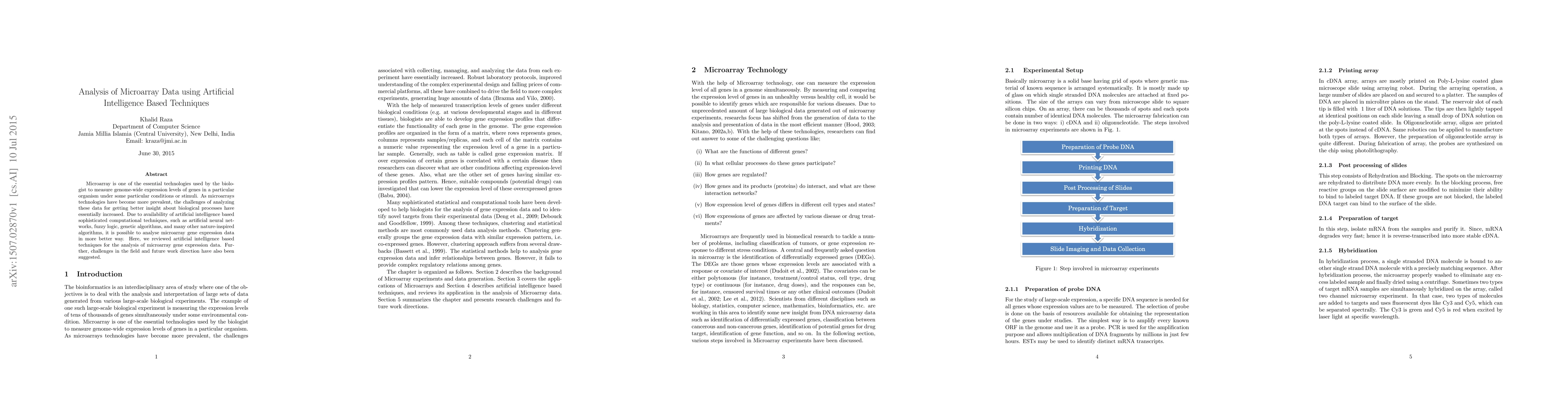 This paper reviews the application of artificial intelligence techniques, including neural networks, fuzzy logic, and genetic algorithms, for analyzing microarray gene expression data to gain deeper insights into biological processes. It also discusses current challenges and proposes directions for future research in this field.