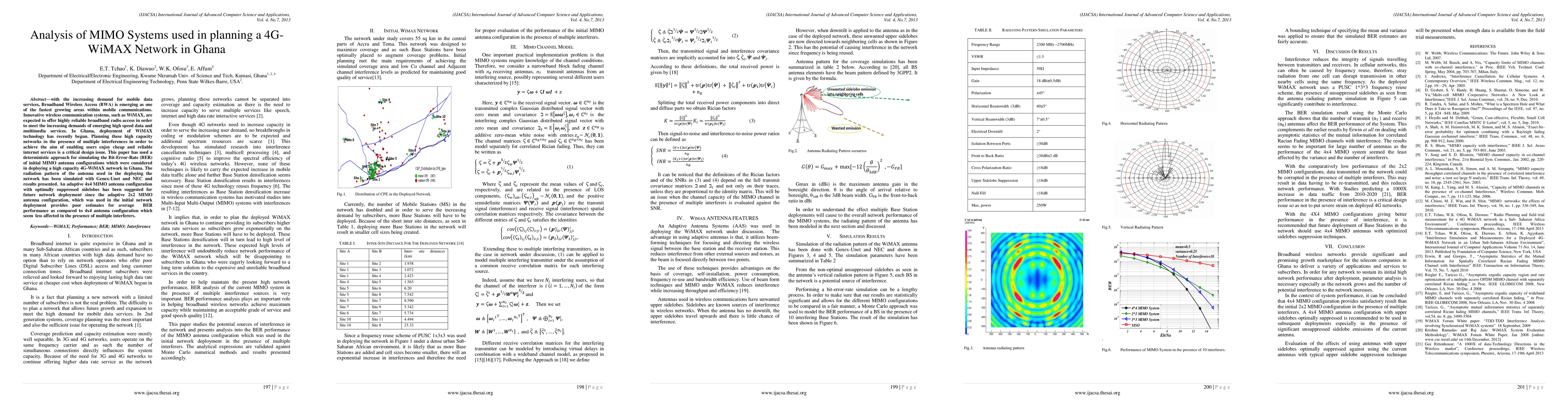 With the increasing demand for mobile data services, Broadband Wireless Access (BWA) is emerging as one of the fastest growing areas within mobile communications. Innovative wireless communication systems, such as WiMAX, are expected to offer highly reliable broadband radio access in order to meet the increasing demands of emerging high speed data and multimedia services. In Ghana, deployment of WiMAX technology has recently begun. Planning these high capacity networks in the presence of multiple interferences in order to achieve the aim of enabling users enjoy cheap and reliable internet services is a critical design issue. This paper has used a deterministic approach for simulating the Bit-Error-Rate (BER) of initial MIMO antenna configurations which were considered in deploying a high capacity 4G-WiMAX network in Ghana. The radiation pattern of the antenna used in the deploying the network has been simulated with Genex-Unet and NEC and results presented. An adaptive 4x4 MIMO antenna configuration with optimally suppressed sidelobes has been suggested for future network deployment since the adaptive 2x2 MIMO antenna configuration, which was used in the initial network deployment provides poor estimates for average BER performance as compared to 4x4 antenna configuration which seem less affected in the presence of multiple interferers.