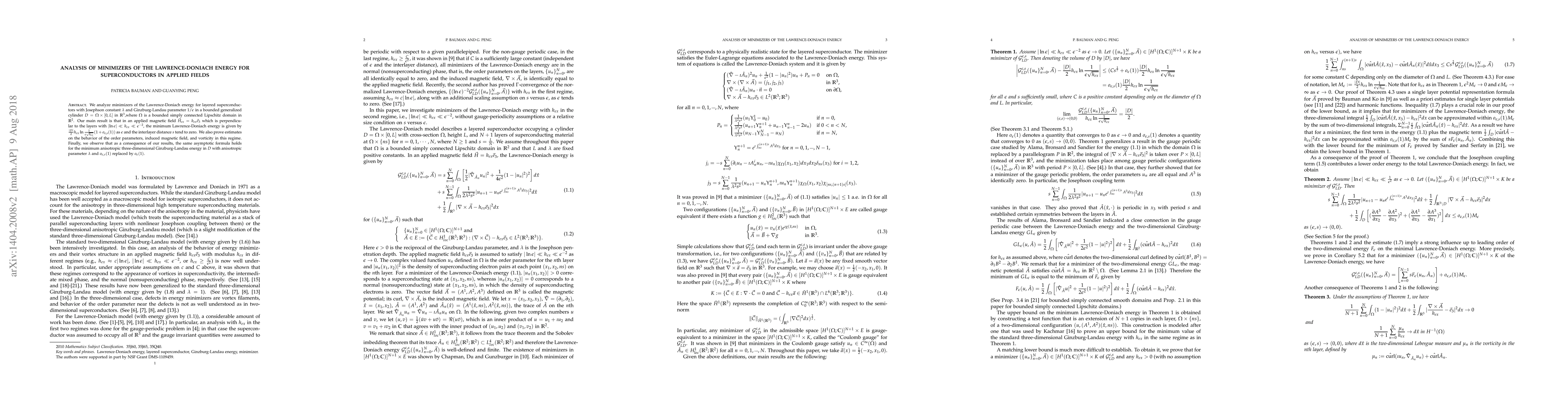 This paper analyzes minimizers of the Lawrence-Doniach energy for layered superconductors in applied perpendicular magnetic fields, proving an asymptotic formula for the minimum energy as the Ginzburg-Landau parameter and interlayer distance approach zero. It also establishes comparison results between the minimum Lawrence-Doniach and three-dimensional anisotropic Ginzburg-Landau energies.