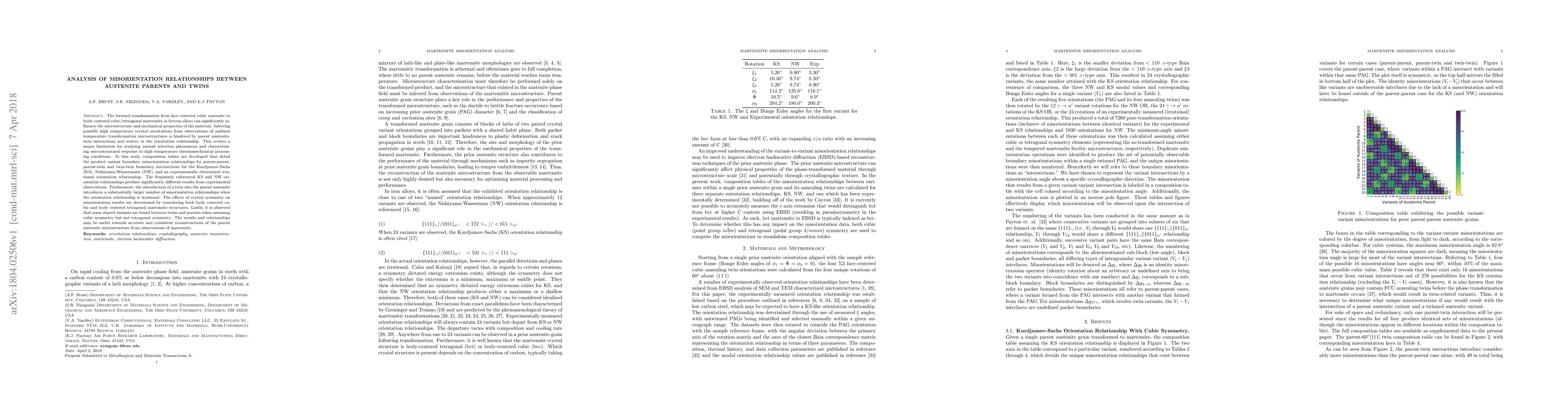 Researchers develop composition tables to describe misorientation relationships between austenite parents and twins in ferrous alloys, revealing inconsistencies with commonly referenced Kurdjumov-Sachs and Nishiyama-Wassermann orientation relationships.