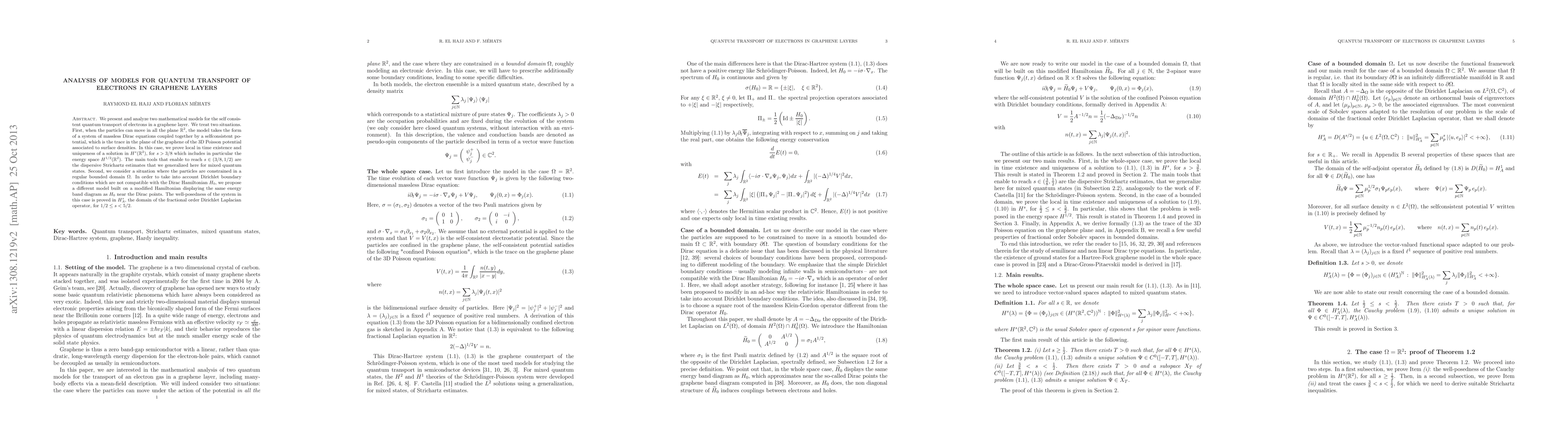 We present and analyze two mathematical models for the self consistent quantum transport of electrons in a graphene layer. We treat two situations. First, when the particles can move in all the plane $\RR^2$, the model takes the form of a system of massless Dirac equations coupled together by a selfconsistent potential, which is the trace in the plane of the graphene of the 3D Poisson potential associated to surface densities. In this case, we prove local in time existence and uniqueness of a solution in $H^s(\RR^2)$, for $s > 3/8$ which includes in particular the energy space $H^{1/2}(\RR^2)$. The main tools that enable to reach $s\in (3/8,1/2)$ are the dispersive Strichartz estimates that we generalized here for mixed quantum states. Second, we consider a situation where the particles are constrained in a regular bounded domain $\Omega$. In order to take into account Dirichlet boundary conditions which are not compatible with the Dirac Hamiltonian $H_{0}$, we propose a different model built on a modified Hamiltonian displaying the same energy band diagram as $H_{0}$ near the Dirac points. The well-posedness of the system in this case is proved in $H^s_{A}$, the domain of the fractional order Dirichlet Laplacian operator, for $1/2\leq s<5/2$.
