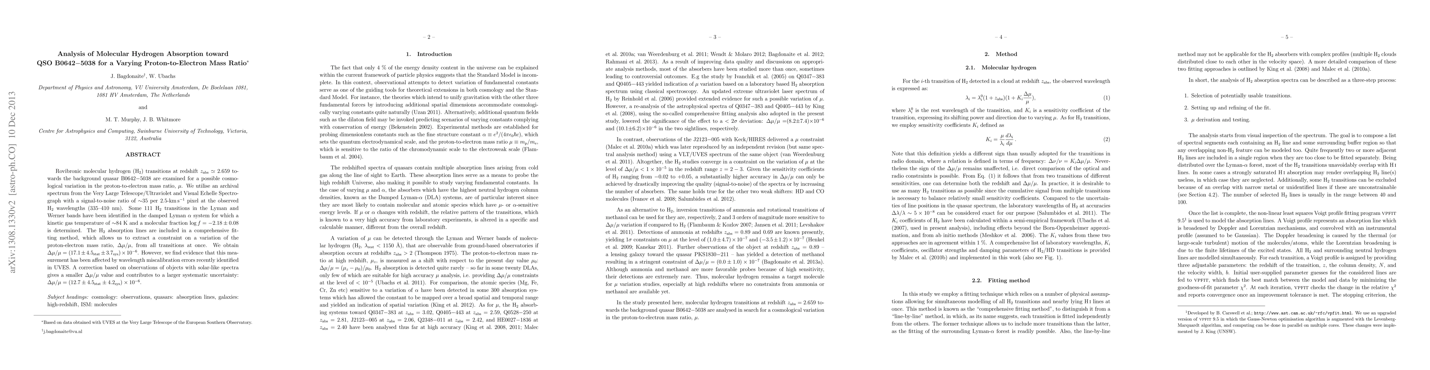 Researchers analyzed hydrogen absorption lines from a distant quasar to search for variations in the proton-to-electron mass ratio, finding evidence of a potential variation with an uncertainty of 10^-6.