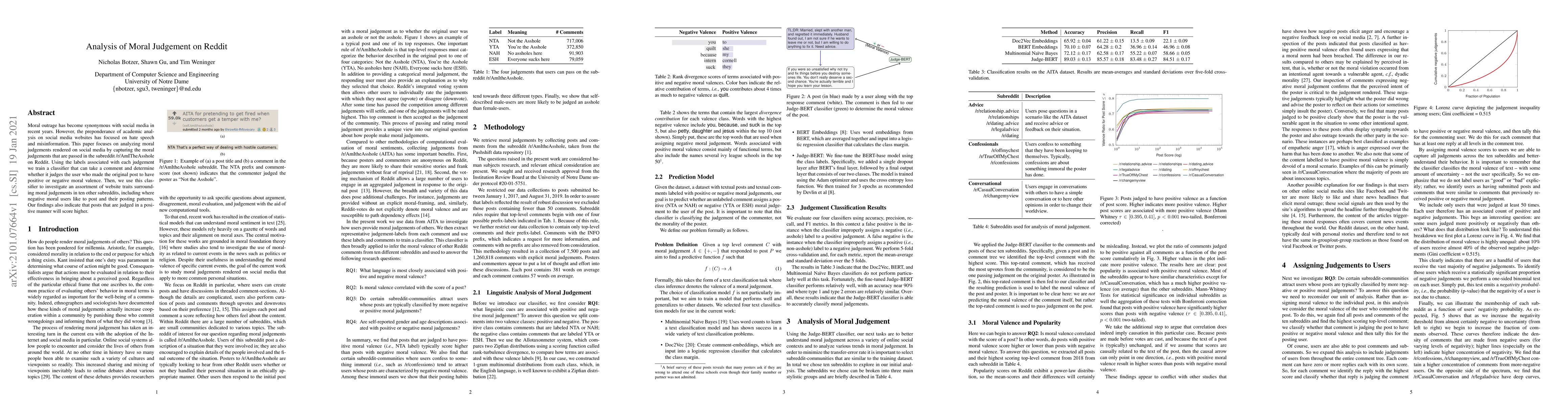 This paper analyzes moral judgments on Reddit's /r/AmITheAsshole subreddit, training a classifier to determine the moral valence of comments. It then investigates moral judgment patterns across ten other subreddits, finding that positively judged posts score higher.
