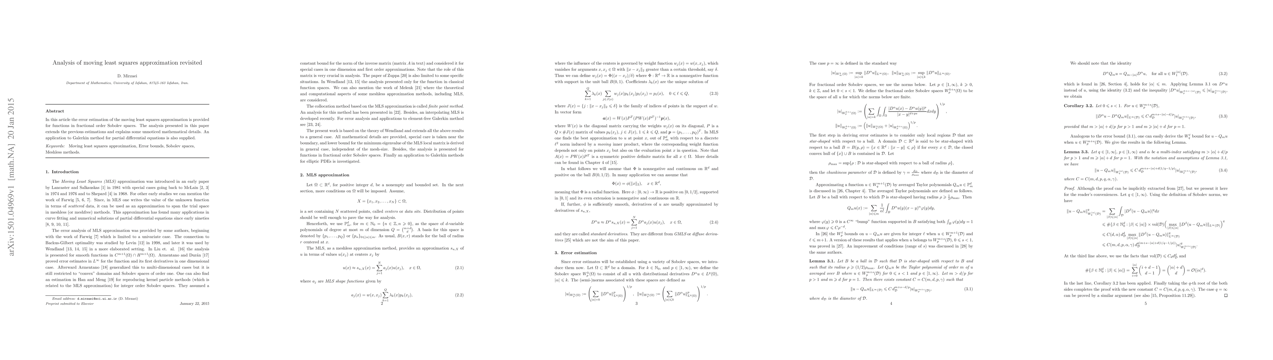 In this article the error estimation of the moving least squares approximation is provided for functions in fractional order Sobolev spaces. The analysis presented in this paper extends the previous estimations and explains some unnoticed mathematical details. An application to Galerkin method for partial differential equations is also supplied.