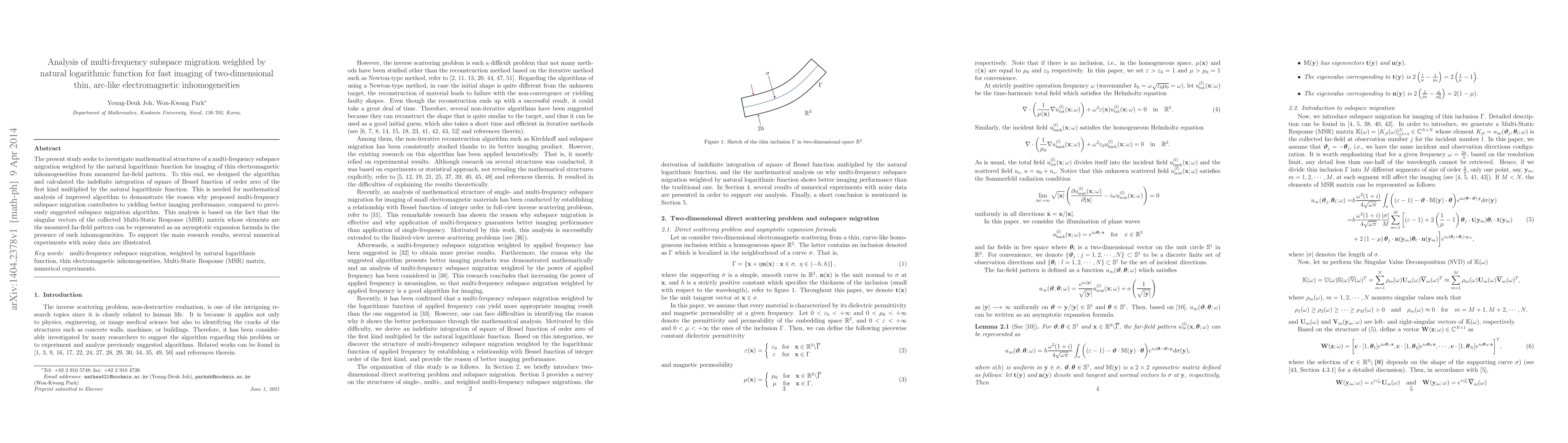 This paper investigates a multi-frequency subspace migration algorithm weighted by the natural logarithmic function for improved imaging of thin, arc-like electromagnetic inhomogeneities. The study demonstrates superior imaging performance through mathematical analysis and numerical experiments, showing that the proposed method outperforms previous algorithms.
