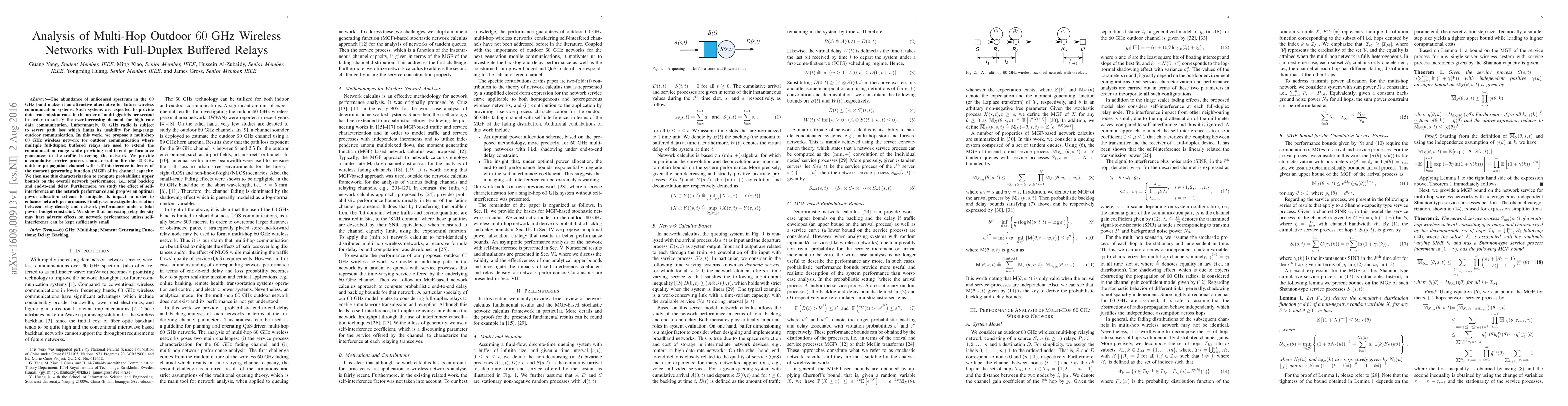 The abundance of unlicensed spectrum in the 60 GHz band makes it an attractive alternative for future wireless communication systems. Such systems are expected to provide data transmission rates in the order of multi-gigabits per second in order to satisfy the ever-increasing demand for high rate data communication. Unfortunately, 60 GHz radio is subject to severe path loss which limits its usability for long-range outdoor communication. In this work, we propose a multi-hop 60 GHz wireless network for outdoor communication where multiple full-duplex buffered relays are used to extend the communication range while providing end-to-end performance guarantees to the traffic traversing the network. We provide a cumulative service process characterization for the 60 GHz outdoor propagation channel with self-interference in terms of the moment generating function (MGF) of its channel capacity. We then use this characterization to compute probabilistic upper bounds on the overall network performance, i.e., total backlog and end-to-end delay. Furthermore, we study the effect of self-interference on the network performance and propose an optimal power allocation scheme to mitigate its impact in order to enhance network performance. Finally, we investigate the relation between relay density and network performance under a total power budget constraint. We show that increasing relay density may have adverse effects on network performance unless self-interference can be kept sufficiently small.