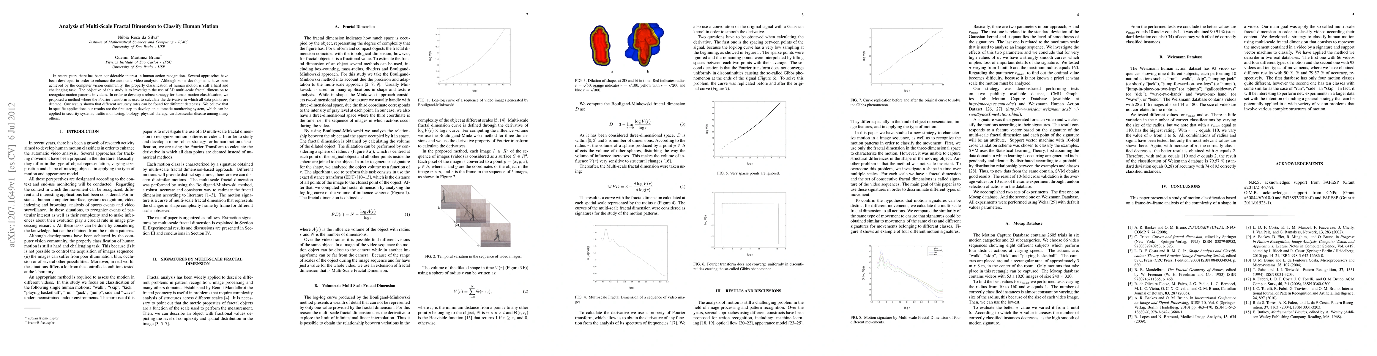 Researchers explored using 3D multi-scale fractal dimension to classify human motion in videos with promising results, showing varying accuracy rates across different databases. The study aims to develop an automatic monitoring system for various applications such as security, traffic monitoring, biology, and physical therapy.