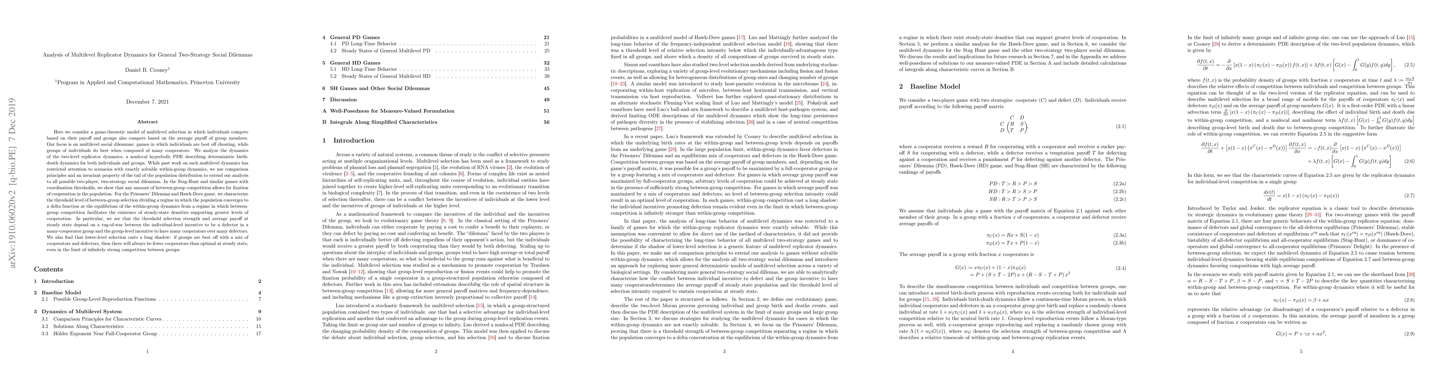 Here we consider a game theoretic model of multilevel selection in which individuals compete based on their payoff and groups also compete based on the average payoff of group members. Our focus is on multilevel social dilemmas: games in which individuals are best off cheating, while groups of individuals do best when composed of many cooperators. We analyze the dynamics of the two-level replicator dynamics, a nonlocal hyperbolic PDE describing deterministic birth-death dynamics for both individuals and groups. While past work on such multilevel dynamics has restricted attention to scenarios with exactly solvable within-group dynamics, we use comparison principles and an invariant property of the tail of the population distribution to extend our analysis to all possible two-player, two-strategy social dilemmas. We characterize the threshold level of between-group selection dividing a regime in which the population converges to a delta function at the equilibrium of the within-group dynamics from a regime in which between-group competition facilitates the existence of steady-state densities supporting greater levels of cooperation. In particular, we see that the threshold selection strength and average payoff at steady state depend on a tug-of-war between the individual-level incentive to be a defector in a many-cooperator group and the group-level incentive to have many cooperators over many defectors. We also find that lower-level selection casts a long shadow: if groups are best off with a mix of cooperators and defectors, then there will always be fewer cooperators than optimal at steady state, even in the limit of infinitely strong competition between groups.
