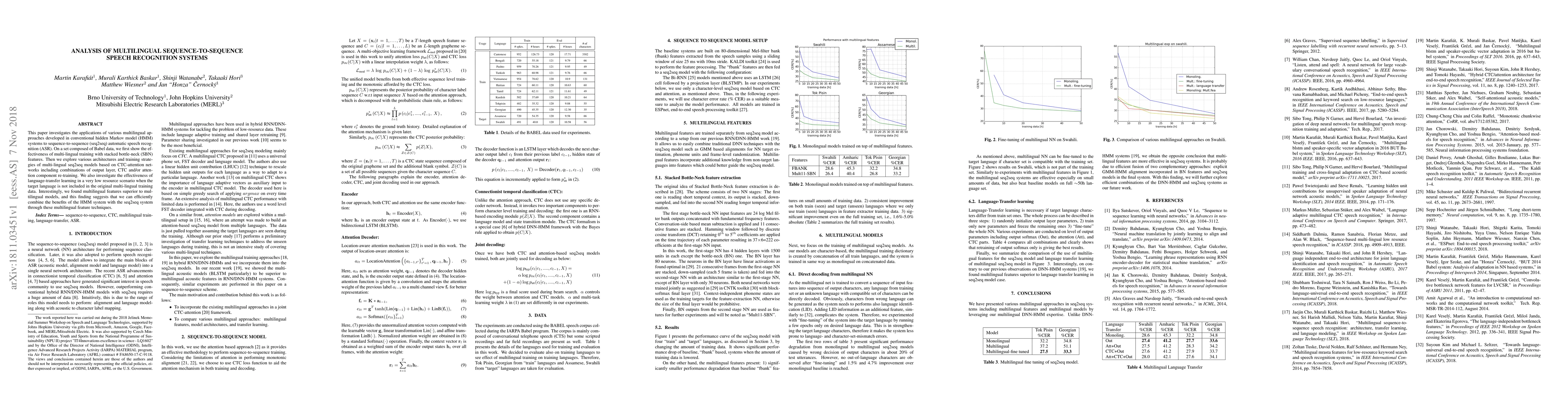 This paper investigates the applications of various multilingual approaches developed in conventional hidden Markov model (HMM) systems to sequence-to-sequence (seq2seq) automatic speech recognition (ASR). On a set composed of Babel data, we first show the effectiveness of multi-lingual training with stacked bottle-neck (SBN) features. Then we explore various architectures and training strategies of multi-lingual seq2seq models based on CTC-attention networks including combinations of output layer, CTC and/or attention component re-training. We also investigate the effectiveness of language-transfer learning in a very low resource scenario when the target language is not included in the original multi-lingual training data. Interestingly, we found multilingual features superior to multilingual models, and this finding suggests that we can efficiently combine the benefits of the HMM system with the seq2seq system through these multilingual feature techniques.