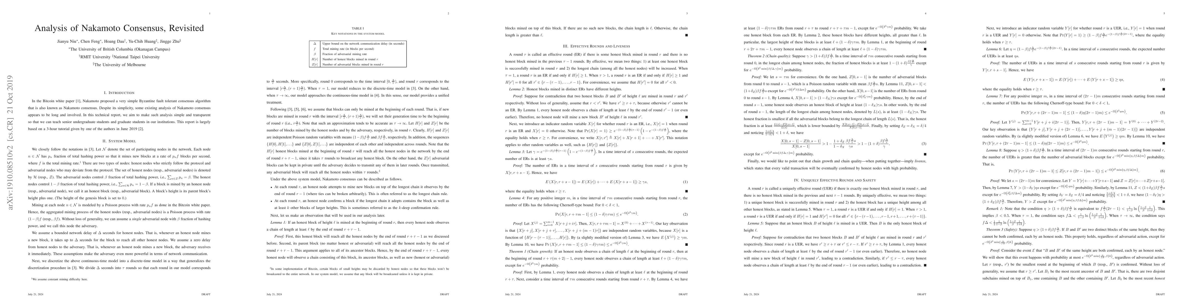 This paper simplifies the analysis of Nakamoto consensus, a Byzantine fault tolerant algorithm proposed by Satoshi Nakamoto in the Bitcoin white paper, to make it accessible for senior undergraduate and graduate students. The report is based on a 2019 tutorial aimed at clarifying the algorithm's workings.
