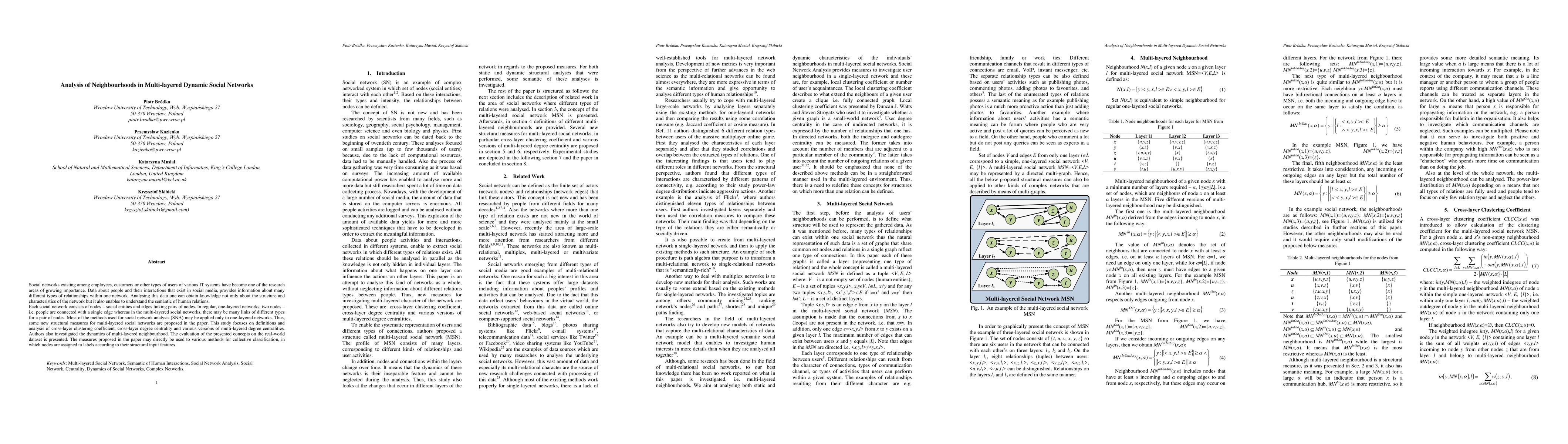 Social networks existing among employees, customers or users of various IT systems have become one of the research areas of growing importance. A social network consists of nodes - social entities and edges linking pairs of nodes. In regular, one-layered social networks, two nodes - i.e. people are connected with a single edge whereas in the multi-layered social networks, there may be many links of different types for a pair of nodes. Nowadays data about people and their interactions, which exists in all social media, provides information about many different types of relationships within one network. Analysing this data one can obtain knowledge not only about the structure and characteristics of the network but also gain understanding about semantic of human relations. Are they direct or not? Do people tend to sustain single or multiple relations with a given person? What types of communication is the most important for them? Answers to these and more questions enable us to draw conclusions about semantic of human interactions. Unfortunately, most of the methods used for social network analysis (SNA) may be applied only to one-layered social networks. Thus, some new structural measures for multi-layered social networks are proposed in the paper, in particular: cross-layer clustering coefficient, cross-layer degree centrality and various versions of multi-layered degree centralities. Authors also investigated the dynamics of multi-layered neighbourhood for five different layers within the social network. The evaluation of the presented concepts on the real-world dataset is presented. The measures proposed in the paper may directly be used to various methods for collective classification, in which nodes are assigned to labels according to their structural input features.
