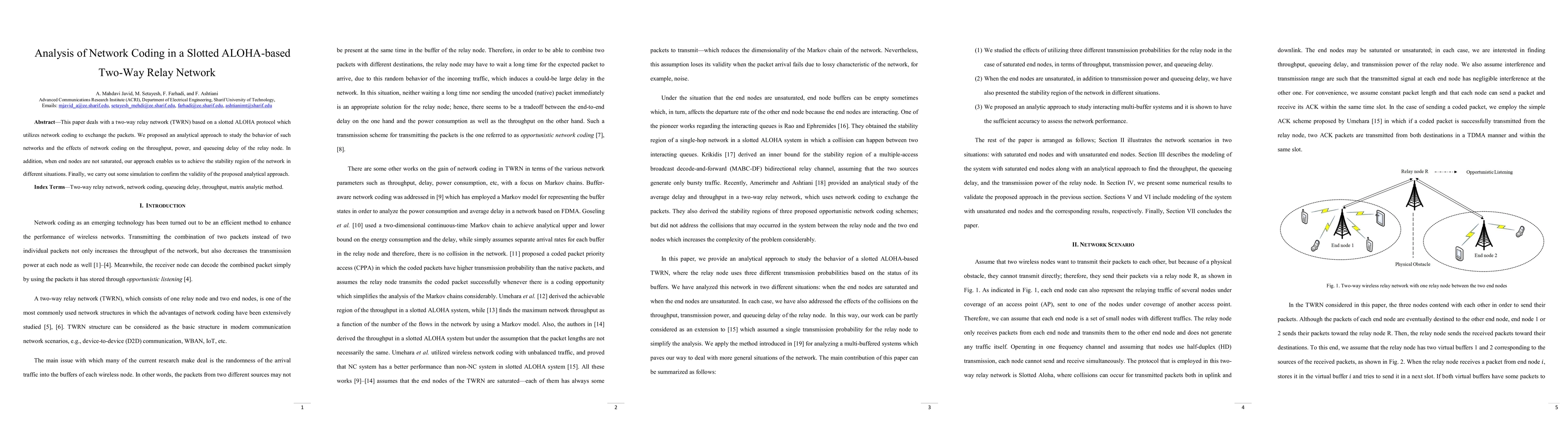 This paper analyzes a slotted ALOHA-based two-way relay network using network coding, proposing an analytical approach to study throughput, power, and queueing delay. Simulation confirms the approach's validity and identifies stability regions under non-saturated end nodes.