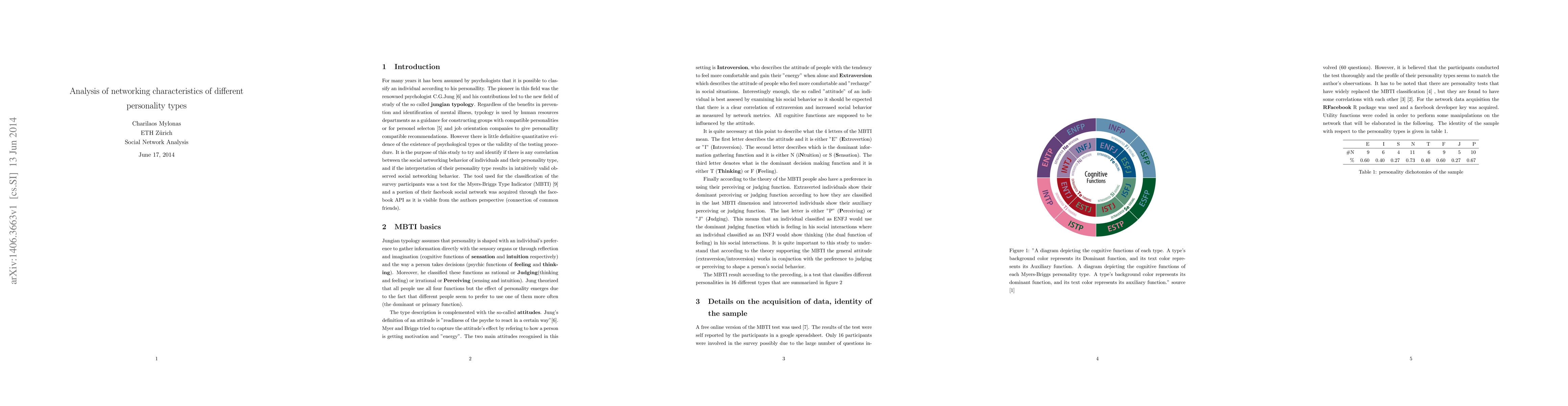 This study analyzes the networking characteristics of different personality types using MBTI classifications and Facebook network data, finding some quantitative support for anecdotal observations about social behaviors associated with various personality types. Despite limited personality data, the results suggest meaningful correlations between social network metrics and personality traits.