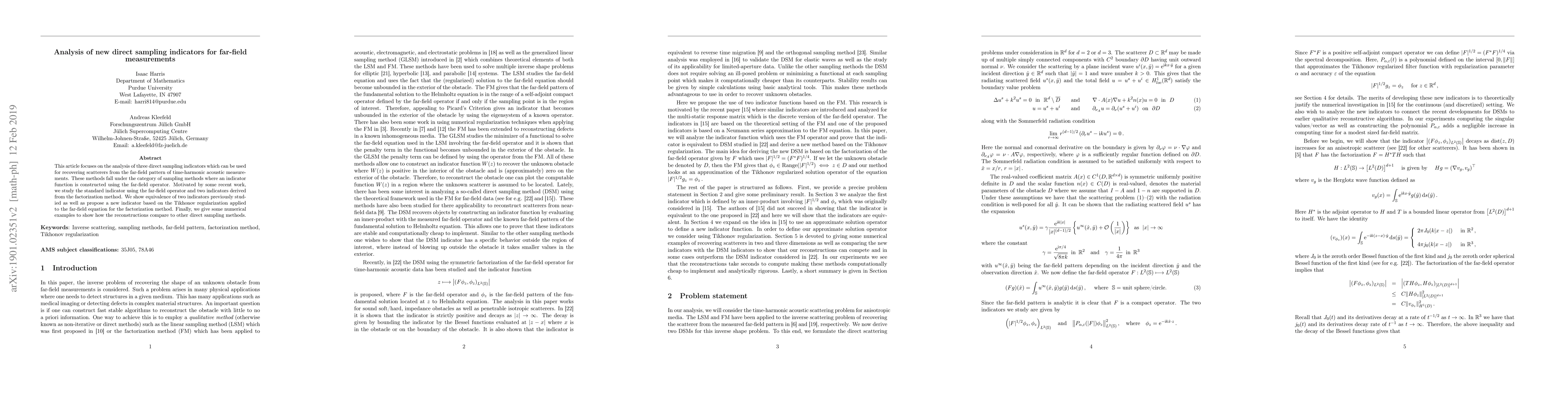 This article focuses on the analysis of three direct sampling indicators which can be used for recovering scatterers from the far-field pattern of time-harmonic acoustic measurements. These methods fall under the category of sampling methods where an indicator function is constructed using the far-field operator. Motivated by some recent work, we study the standard indicator using the far-field operator and two indicators derived from the factorization method. We show the equivalence of two indicators previously studied as well as propose a new indicator based on the Tikhonov regularization applied to the far-field equation for the factorization method. Finally, we give some numerical examples to show how the reconstructions compare to other direct sampling methods.