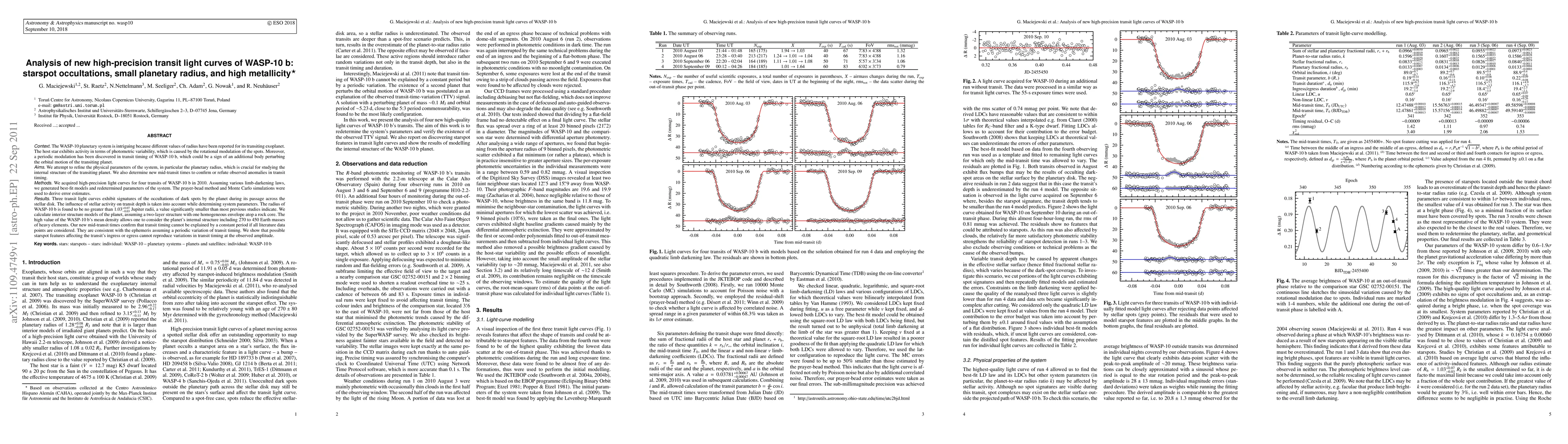 This paper refines the physical parameters of the WASP-10 b exoplanet, finding a smaller planetary radius of no greater than 1.03 Jupiter radii, and high metallicity. It also confirms anomalies in transit timing, suggesting an additional perturbing body.