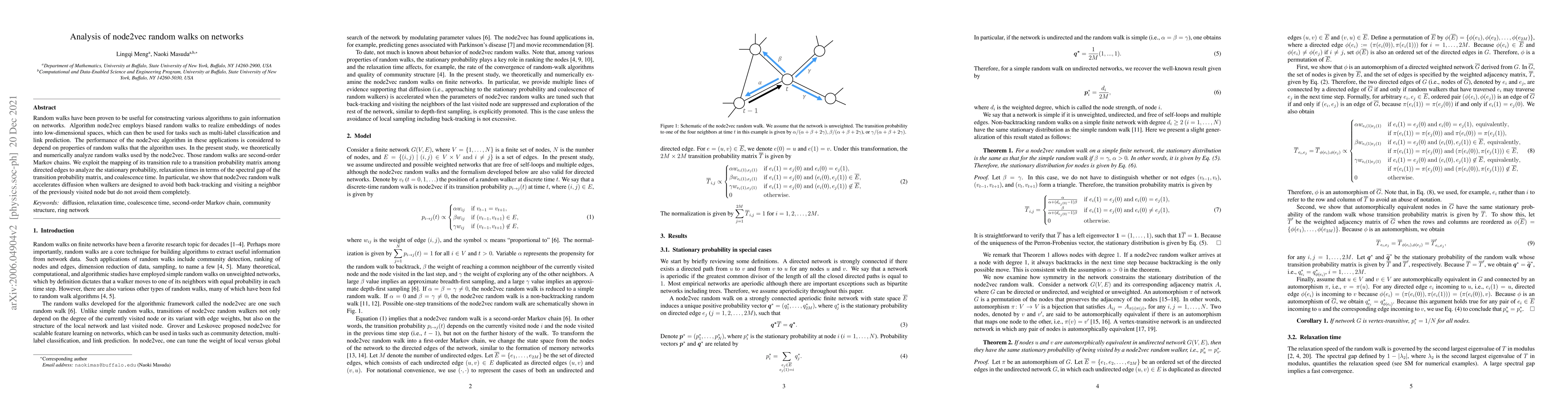 This paper theoretically and numerically analyzes the random walks used in the node2vec algorithm, showing that these second-order Markov chains enhance diffusion when designed to avoid back-tracking and repeated visits, but not entirely. The study explores stationary probabilities, relaxation times, and coalescence time, highlighting the algorithm's efficiency in network embedding tasks.