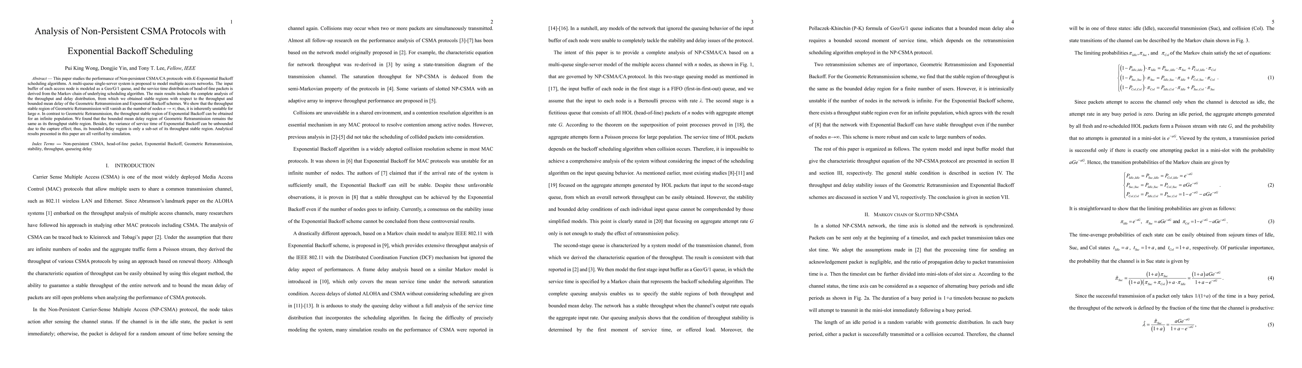 This paper studies the performance of Non-persistent CSMA/CA protocols with K-Exponential Backoff scheduling algorithms. A multi-queue single-server system is proposed to model multiple access networks. The input buffer of each access node is modeled as a Geo/G/1 queue, and the service time distribution of head-of-line packets is derived from the Markov chain of underlying scheduling algorithm. The main results include the complete analysis of the throughput and delay distribution, from which we obtained stable regions with respect to the throughput and bounded mean delay of the Geometric Retransmission and Exponential Backoff schemes. We show that the throughput stable region of Geometric Retransmission will vanish as the number of nodes n \rightarrow \infty; thus, it is inherently unstable for large n. In contrast to Geometric Retransmission, the throughput stable region of Exponential Backoff can be obtained for an infinite population. We found that the bounded mean delay region of Geometric Retransmission remains the same as its throughput stable region. Besides, the variance of service time of Exponential Backoff can be unbounded due to the capture effect; thus, its bounded delay region is only a sub-set of its throughput stable region. Analytical results presented in this paper are all verified by simulation.