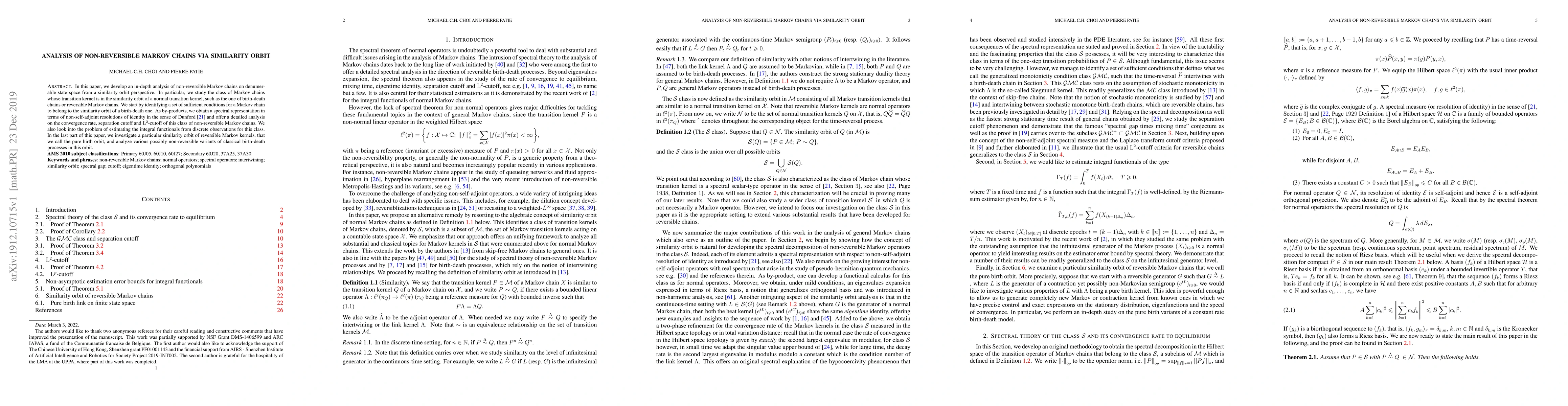 This paper explores non-reversible Markov chains on denumerable state space through the lens of similarity orbits, focusing on chains whose transition kernels resemble those of birth-death or reversible chains. It provides conditions for such chains, analyzes spectral representations, and examines convergence rates, cutoff phenomena, and estimation of integral functionals from discrete observations.
