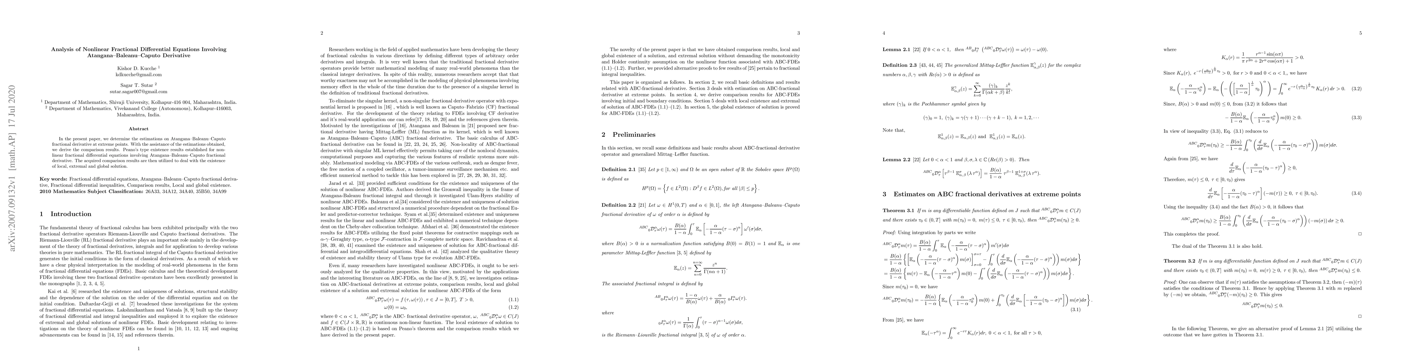 This paper investigates the Atangana-Baleanu-Caputo fractional derivative, providing estimations at extreme points and deriving comparison results. It establishes Peano's type existence results for nonlinear fractional differential equations involving this derivative and uses these results to address the existence of local, extremal, and global solutions.