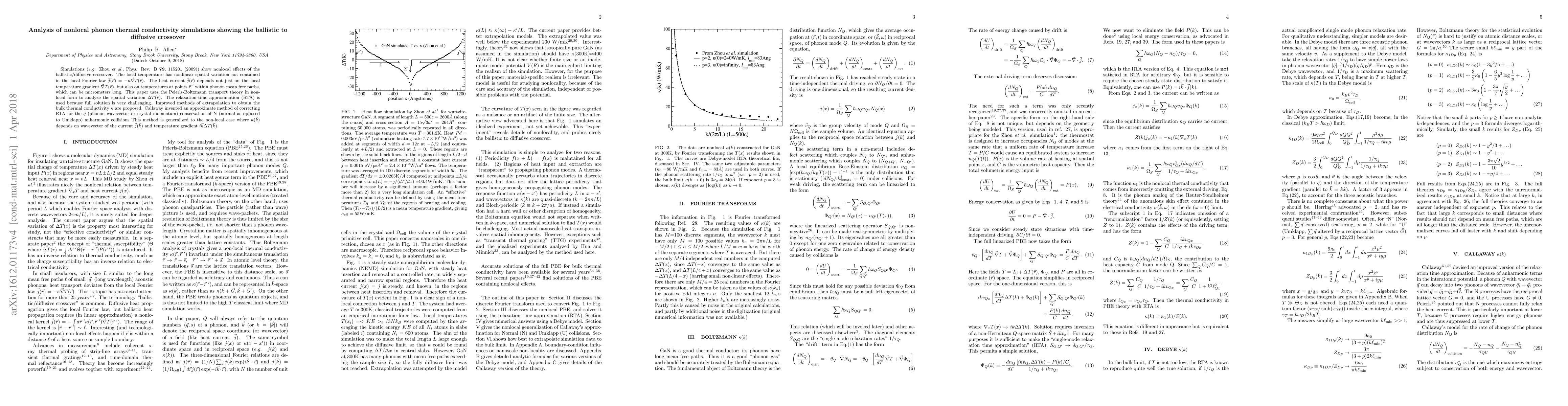Simulations (e.g. Zhou et al., Phys. Rev. B 79, 115201 (2009)) show nonlocal effects of the ballistic/diffusive crossover. The local temperature has nonlinear spatial variation not contained in the local Fourier law $\vec{j}(\vec{r})=-\kappa\vec{\nabla}T(\vec{r})$. The heat current $\vec{j}(\vec{r})$ depends not just on the local temperature gradient $\vec{\nabla}T(\vec{r})$, but also on temperatures at points $\vec{r}^{ \ \prime}$ within phonon mean free paths, which can be micrometers long. This paper uses the Peierls-Boltzmann transport theory in non-local form to analyze the spatial variation $\Delta T(\vec{r})$. The relaxation-time approximation (RTA) is used because full solution is very challenging. Improved methods of extrapolation to obtain the bulk thermal conductivity $\kappa$ are proposed. Callaway invented an approximate method of correcting RTA for the $\vec{q}$ (phonon wavevector or crystal momentum) conservation of N (normal as opposed to Umklapp) anharmonic collisions This method is generalized to the non-local case where $\kappa(\vec{k})$ depends on wavevector of the current $\vec{j}(\vec{k})$ and temperature gradient $i\vec{k}\Delta T(\vec{k})$.
