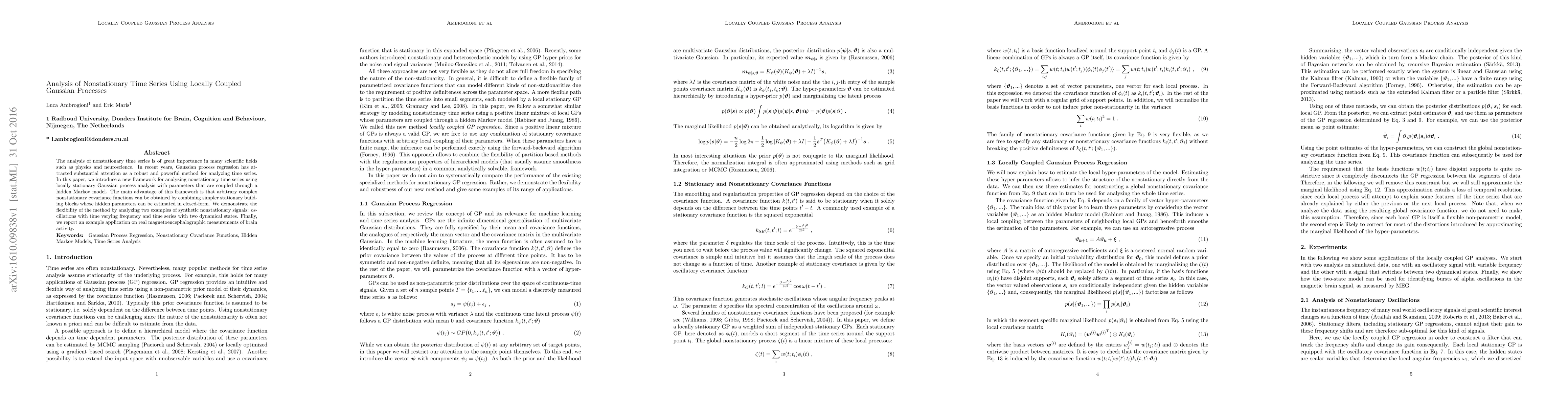 This paper proposes a novel framework for analyzing nonstationary time series using locally coupled Gaussian processes, combining stationary building blocks through a hidden Markov model to estimate complex nonstationary covariance functions. The method's flexibility is demonstrated through synthetic signal examples and applied to real magnetoencephalographic brain activity data.