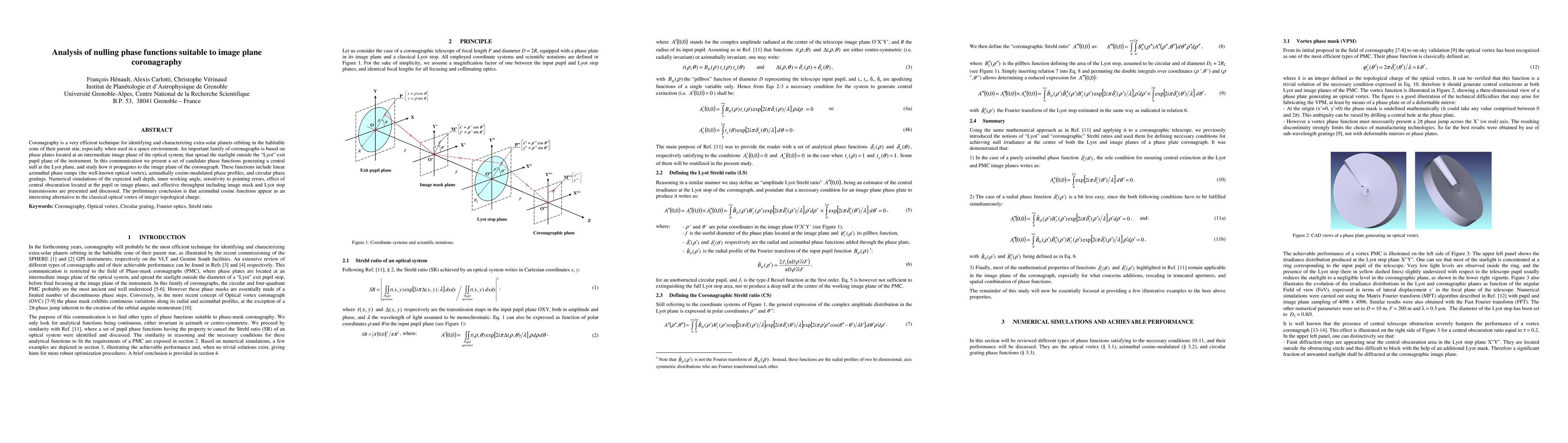 Coronagraphy is a very efficient technique for identifying and characterizing extra-solar planets orbiting in the habitable zone of their parent star, especially when used in a space environment. An important family of coronagraphs is based on phase plates located at an intermediate image plane of the optical system, that spread the starlight outside the "Lyot" exit pupil plane of the instrument. In this communication we present a set of candidate phase functions generating a central null at the Lyot plane, and study how it propagates to the image plane of the coronagraph. These functions include linear azimuthal phase ramps (the well-known optical vortex), azimuthally cosine-modulated phase profiles, and circular phase gratings. Numerical simulations of the expected null depth, inner working angle, sensitivity to pointing errors, effect of central obscuration located at the pupil or image planes, and effective throughput including image mask and Lyot stop transmissions are presented and discussed. The preliminary conclusion is that azimuthal cosine functions appear as an interesting alternative to the classical optical vortex of integer topological charge.