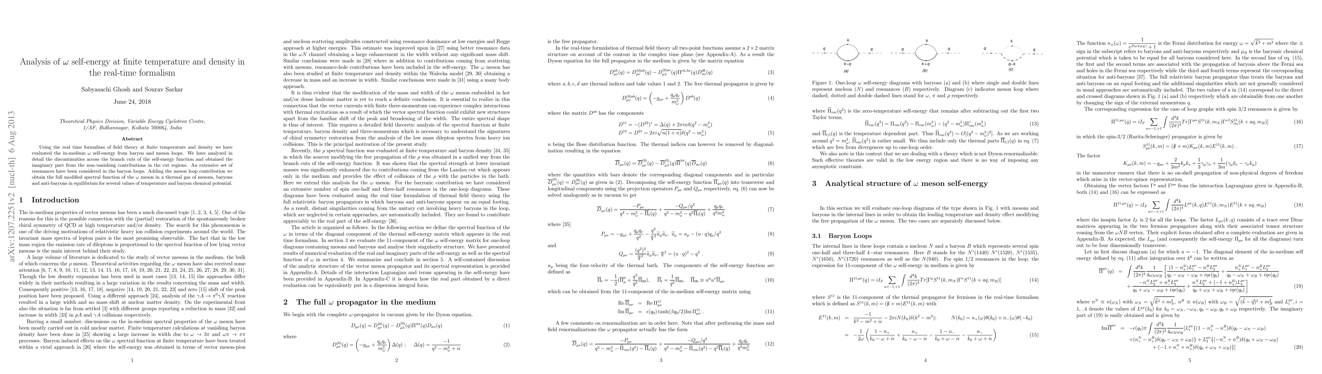 This paper evaluates the $\omega$ meson self-energy in a medium at finite temperature and density using the real-time formalism, considering contributions from baryon and meson loops. It analyzes the imaginary part of the self-energy and derives the full modified spectral function for $\omega$ in thermal equilibrium.
