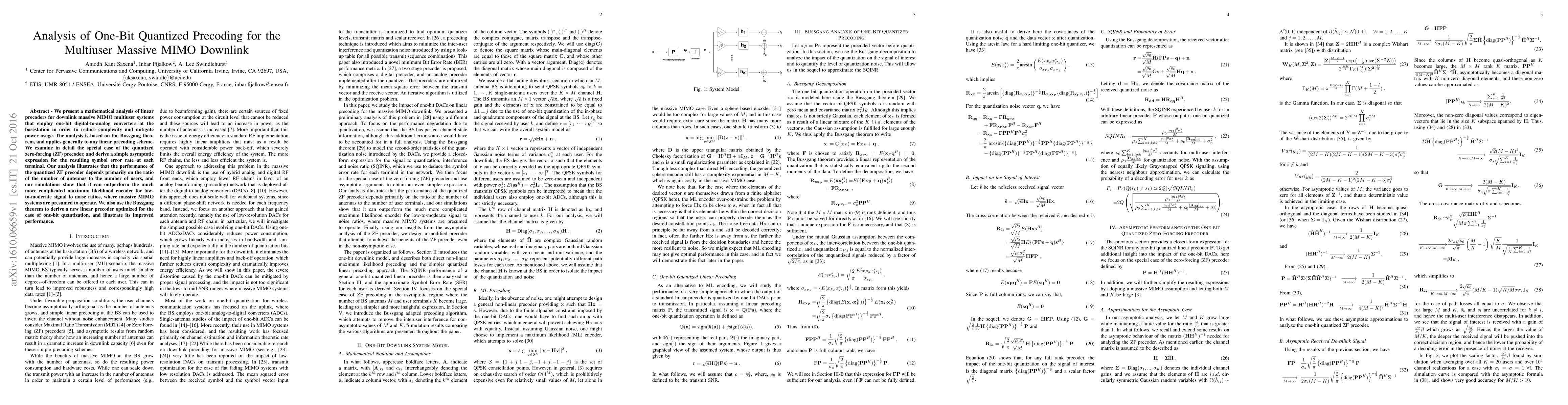We present a mathematical analysis of linear precoders for downlink massive MIMO multiuser systems that employ one-bit digital-to-analog converters at the basestation in order to reduce complexity and mitigate power usage. The analysis is based on the Bussgang theorem, and applies generally to any linear precoding scheme. We examine in detail the special case of the quantized zero-forcing (ZF) precoder, and derive a simple asymptotic expression for the resulting symbol error rate at each terminal. Our analysis illustrates that the performance of the quantized ZF precoder depends primarily on the ratio of the number of antennas to the number of users, and our simulations show that it can outperform the much more complicated maximum likelihood encoder for low-to-moderate signal to noise ratios, where massive MIMO systems are presumed to operate. We also use the Bussgang theorem to derive a new linear precoder optimized for the case of one-bit quantization, and illustrate its improved performance.