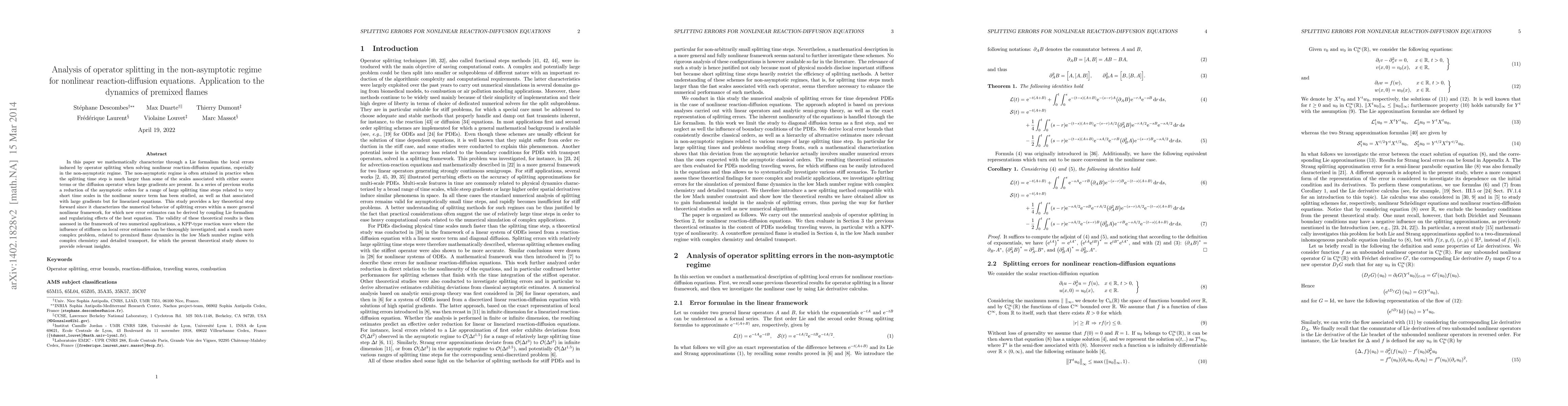 In this paper we mathematically characterize through a Lie formalism the local errors induced by operator splitting when solving nonlinear reaction-diffusion equations, especially in the non-asymptotic regime. The non-asymptotic regime is often attained in practice when the splitting time step is much larger than some of the scales associated with either source terms or the diffusion operator when large gradients are present. In a series of previous works a reduction of the asymptotic orders for a range of large splitting time steps related to very short time scales in the nonlinear source term has been studied, as well as that associated with large gradients but for linearized equations. This study provides a key theoretical step forward since it characterizes the numerical behavior of splitting errors within a more general nonlinear framework, for which new error estimates can be derived by coupling Lie formalism and regularizing effects of the heat equation. The validity of these theoretical results is then assessed in the framework of two numerical applications, a KPP-type reaction wave where the influence of stiffness on local error estimates can be thoroughly investigated; and a much more complex problem, related to premixed flame dynamics in the low Mach number regime with complex chemistry and detailed transport, for which the present theoretical study shows to provide relevant insights.
