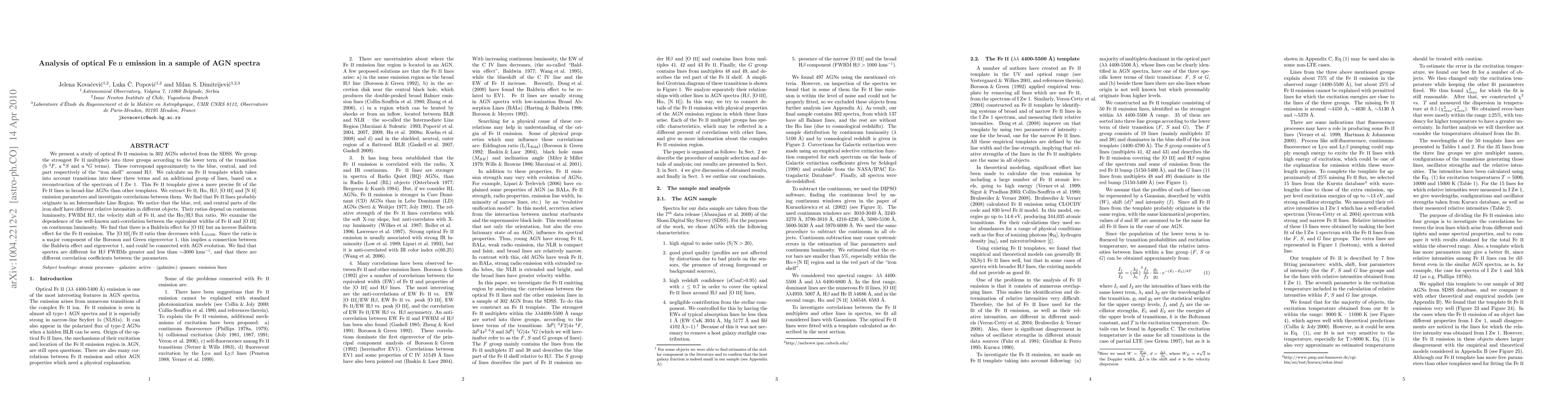 We present a study of optical Fe II emission in 302 AGNs selected from the SDSS. We group the strongest Fe II multiplets into three groups according to the lower term of the transition (b $^4$F, a $^6$S and a $^4$G terms). These correspond approximately to the blue, central, and red part respectively of the "iron shelf" around Hb. We calculate an Fe II template which takes into account transitions into these three terms and an additional group of lines, based on a reconstruction of the spectrum of I Zw 1. This Fe II template gives a more precise fit of the Fe II lines in broad-line AGNs than other templates. We extract Fe II, Ha, Hb, [O III] and [N II] emission parameters and investigate correlations between them. We find that Fe II lines probably originate in an Intermediate Line Region. We notice that the blue, red, and central parts of the iron shelf have different relative intensities in different objects. Their ratios depend on continuum luminosity, FWHM Hb, the velocity shift of Fe II, and the Ha/Hb flux ratio. We examine the dependence of the well-known anti-correlation between the equivalent widths of Fe II and [O III] on continuum luminosity. We find that there is a Baldwin effect for [O III] but an inverse Baldwin effect for the Fe II emission. The [O III]/Fe II ratio thus decreases with L\lambda5100. Since the ratio is a major component of the Boroson and Green eigenvector 1, this implies a connection between the Baldwin effect and eigenvector 1, and could be connected with AGN evolution. We find that spectra are different for Hb FWHMs greater and less than ~3000 km/s, and that there are different correlation coefficients between the parameters.