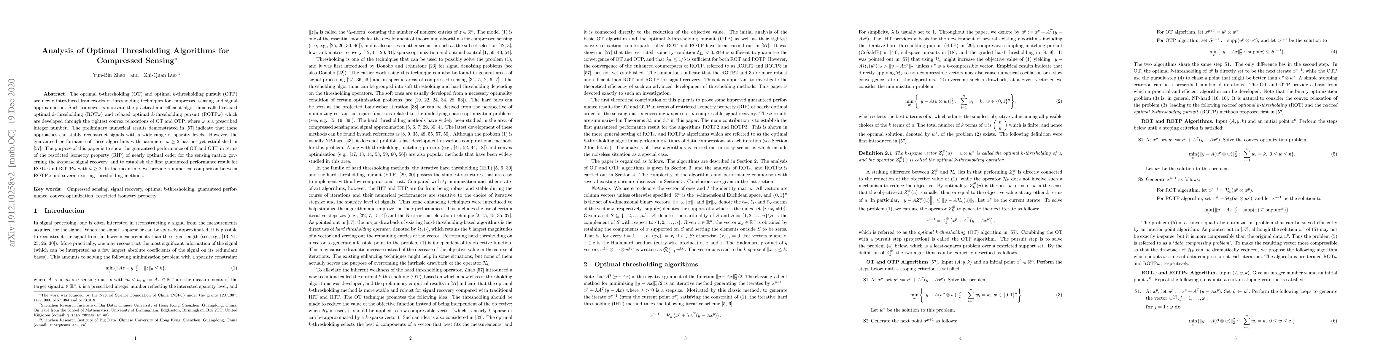The optimal $k$-thresholding (OT) and optimal $k$-thresholding pursuit (OTP) are newly introduced frameworks of thresholding techniques for compressed sensing and signal approximation. Such frameworks motivate the practical and efficient algorithms called relaxed optimal $k$-thresholding ($\textrm{ROT}\omega$) and relaxed optimal $k$-thresholding pursuit ($\textrm{ROTP}\omega$) which are developed through the tightest convex relaxations of OT and OTP, where $\omega$ is a prescribed integer number. The preliminary numerical results demonstrated in \cite{Z19} indicate that these approaches can stably reconstruct signals with a wide range of sparsity levels. However, the guaranteed performance of these algorithms with parameter $ \omega \geq 2 $ has not yet established in \cite{Z19}. The purpose of this paper is to show the guaranteed performance of OT and OTP in terms of the restricted isometry property (RIP) of nearly optimal order for the sensing matrix governing the $k$-sparse signal recovery, and to establish the first guaranteed performance result for $\textrm{ROT}\omega$ and $\textrm{ROTP}\omega$ with $ \omega\geq 2.$ In the meantime, we provide a numerical comparison between ROTP$\omega$ and several existing thresholding methods.