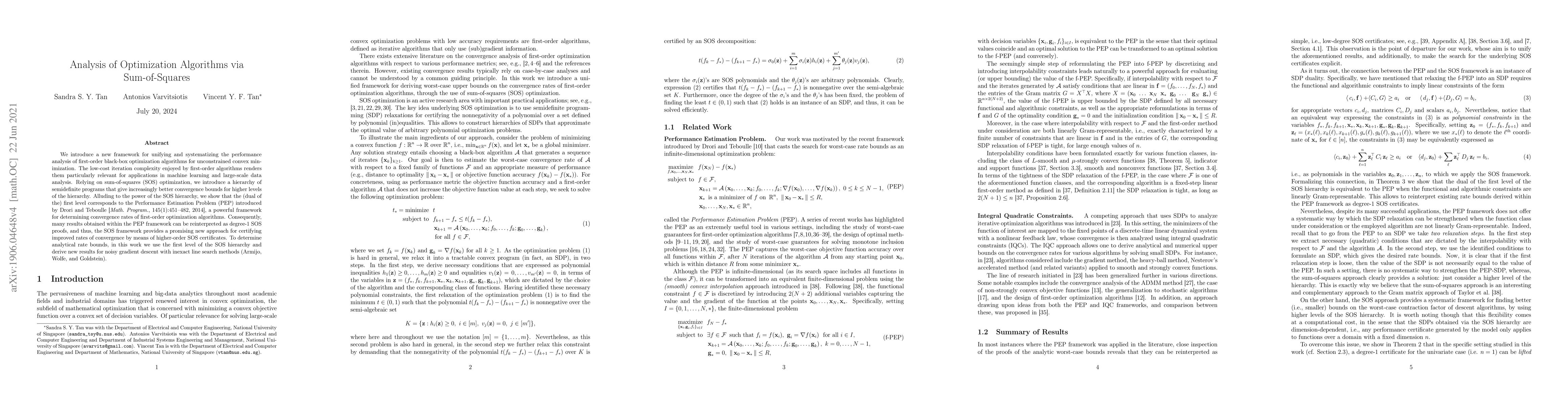 This paper presents a new framework using sum-of-squares (SOS) optimization to analyze and unify first-order black-box optimization algorithms for convex minimization. The authors derive a hierarchy of semidefinite programs that provide increasingly better convergence bounds, reinterpreting existing results within the Performance Estimation Problem framework as degree-1 SOS proofs.