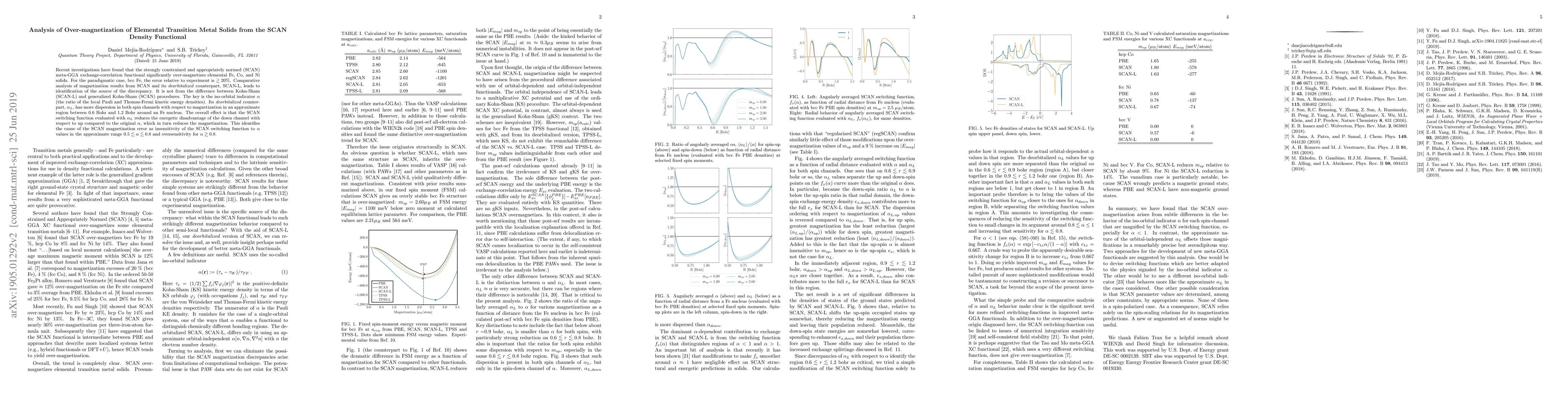 Recent investigations have found that the strongly constrained and appropriately normed (SCAN) meta-GGA exchange-correlation functional significantly over-magnetizes elemental Fe, Co, and Ni solids. For the paradigmatic case, bcc Fe, the error relative to experiment is $\gtrsim 20 \%$. Comparative analysis of magnetization results from SCAN and its \textit{deorbitalized} counterpart, SCAN-L, leads to identification of the source of the discrepancy. It is not from the difference between Kohn-Sham (SCAN-L) and generalized Kohn-Sham (SCAN) procedures. The key is the iso-orbital indicator $\alpha$ (the ratio of the local Pauli and Thomas-Fermi kinetic energy densities). Its \textit{deorbitalized} counterpart, $\alpha_L$, has more dispersion in both spin channels with respect to magnetization in an approximate region between 0.6 Bohr and 1.2 Bohr around an Fe nucleus. The overall effect is that the SCAN switching function evaluated with $\alpha_L$ reduces the energetic disadvantage of the down channel with respect to up compared to the original $\alpha$, which in turn reduces the magnetization. This identifies the cause of the SCAN magnetization error as insensitivity of the SCAN switching function to $\alpha$ values in the approximate range $0.5 \lesssim \alpha \lesssim 0.8$ and oversensitivity for $\alpha \gtrsim 0.8$.