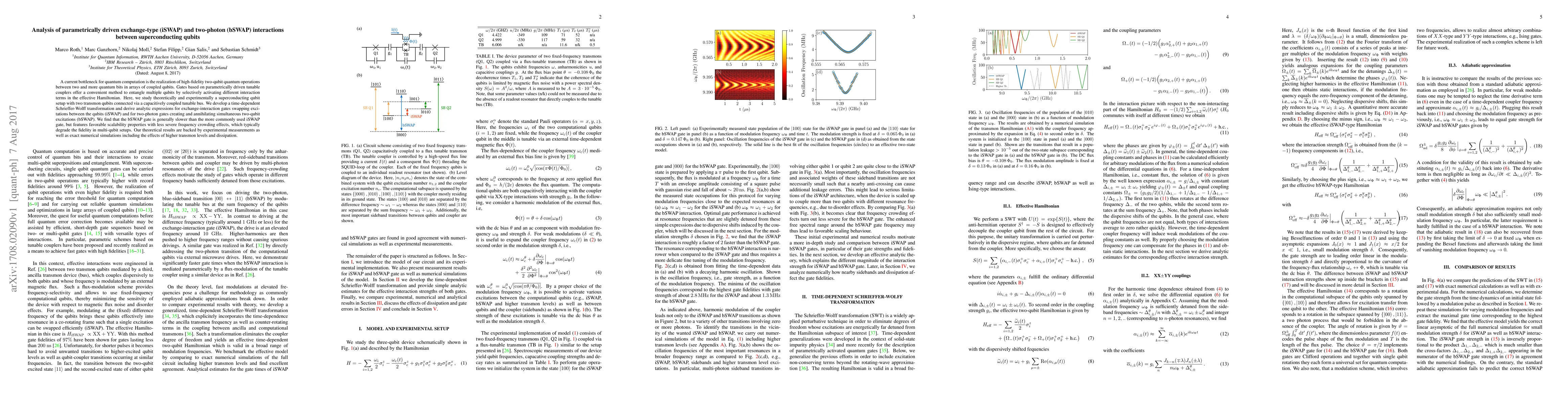 This paper investigates theoretically and experimentally parametrically driven exchange-type (iSWAP) and two-photon (bSWAP) interactions between superconducting qubits, finding that while bSWAP gates are slower than iSWAP, they offer better scalability and reduced frequency crowding effects. Experimental and numerical results support the theoretical findings.