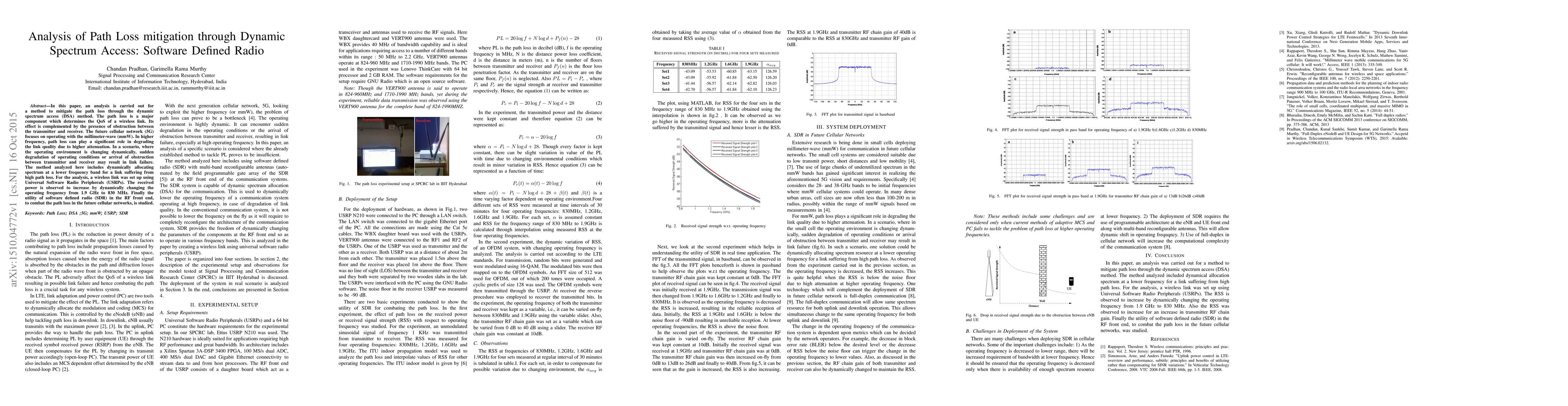 This paper analyzes a method to mitigate path loss using dynamic spectrum access (DSA) with software-defined radio (SDR) to improve wireless link quality. By dynamically allocating spectrum at lower frequencies, the study observes an increase in received power, demonstrating SDR's utility in future cellular networks.
