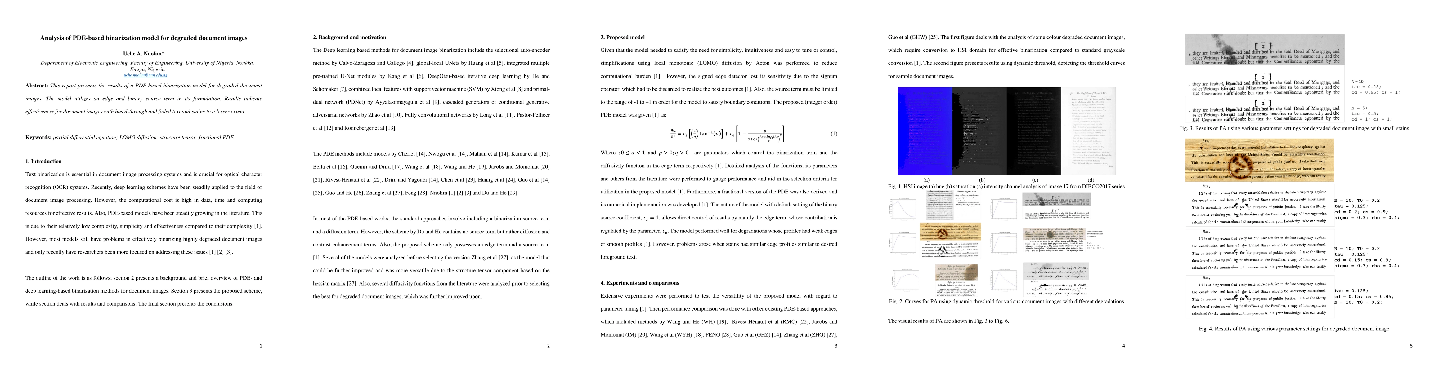 This paper evaluates a PDE-based binarization model for degraded document images, showing effectiveness in handling bleed-through and faded text, though with lesser success for images with stains.
