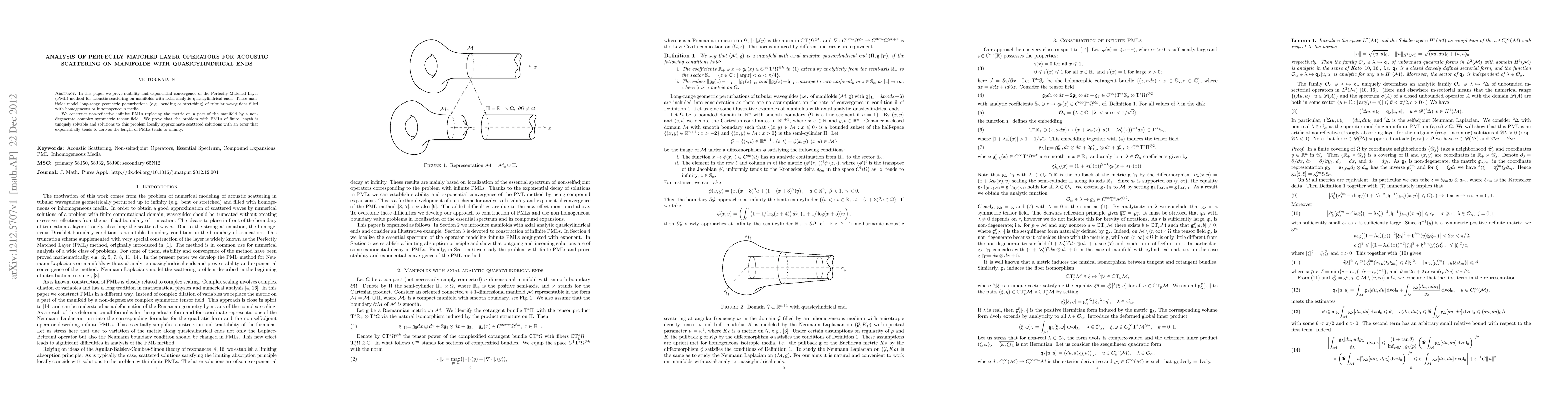 We prove stability and exponential convergence of the Perfectly Matched Layer (PML) method for acoustic scattering on manifolds with axial analytic quasicylindrical ends. These manifolds model long-range geometric perturbations (e.g. bending or stretching) of tubular waveguides filled with homogeneous or inhomogeneous media. We construct non-reflective infinite PMLs replacing the metric on a part of the manifold by a non-degenerate complex symmetric tensor field. We prove that the problem with PMLs of finite length is uniquely solvable and solutions to this problem locally approximate scattered solutions with an error that exponentially tends to zero as the length of PMLs tends to infinity.