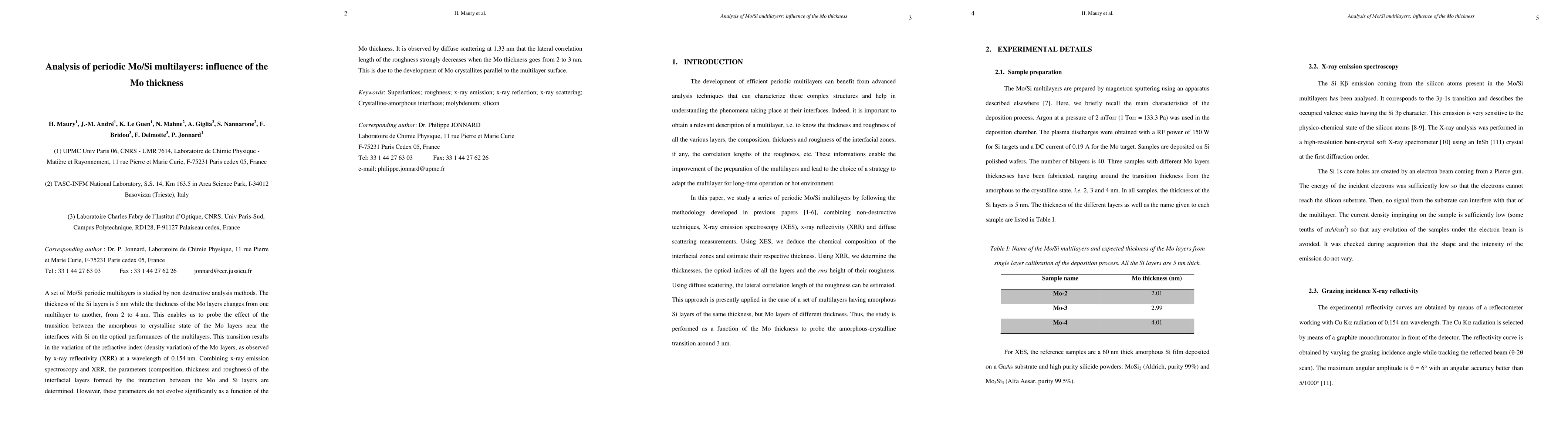 A set of Mo/Si periodic multilayers is studied by non destructive analysis methods. The thickness of the Si layers is 5 nm while the thickness of the Mo layers changes from one multilayer to another, from 2 to 4 nm. This enables us to probe the effect of the transition between the amorphous to crystalline state of the Mo layers near the interfaces with Si on the optical performances of the multilayers. This transition results in the variation of the refractive index (density variation) of the Mo layers, as observed by x-ray reflectivity (XRR) at a wavelength of 0.154 nm. Combining x-ray emission spectroscopy and XRR, the parameters (composition, thickness and roughness) of the interfacial layers formed by the interaction between the Mo and Si layers are determined. However, these parameters do not evolve significantly as a function of the Mo thickness. It is observed by diffuse scattering at 1.33 nm that the lateral correlation length of the roughness strongly decreases when the Mo thickness goes from 2 to 3 nm. This is due to the development of Mo crystallites parallel to the multilayer surface.