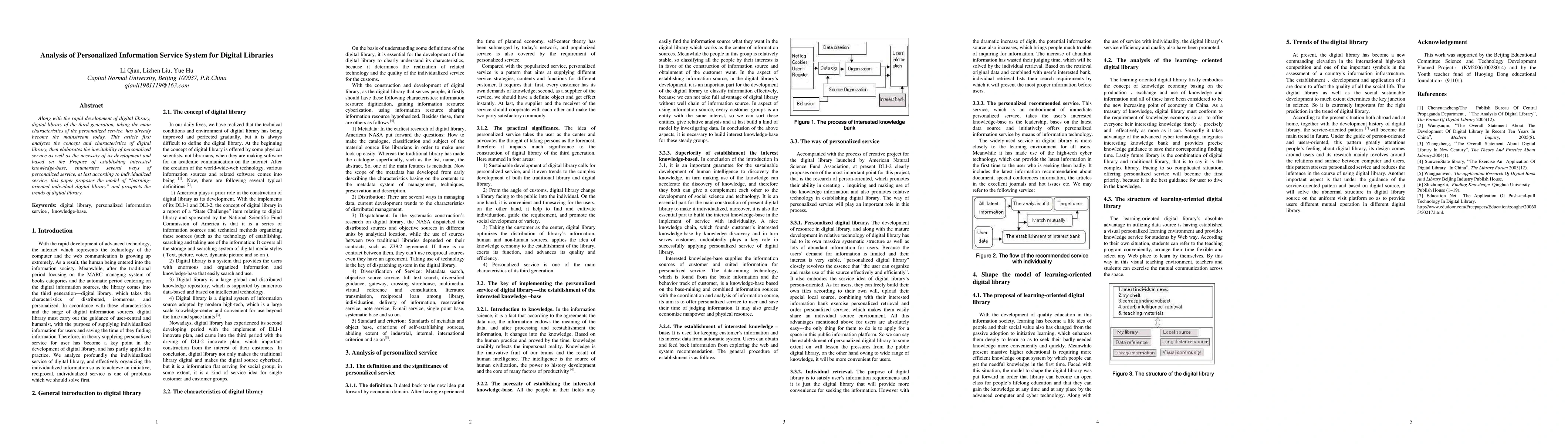 Along with the rapid development of digital library, digital library of the third generation, taking the main characteristics of the personalized service, has already become the mainstream today. This article first analyzes the concept and characteristics of digital library, then elaborates the inevitability of personalized service as well as the necessity of its development and based on the Propose of establishing interested knowledge-base, enumerates several ways of personalized service, at last according to individualized service, this paper proposes the model of "learningoriented individual digital library" and prospects the trends of digital library.