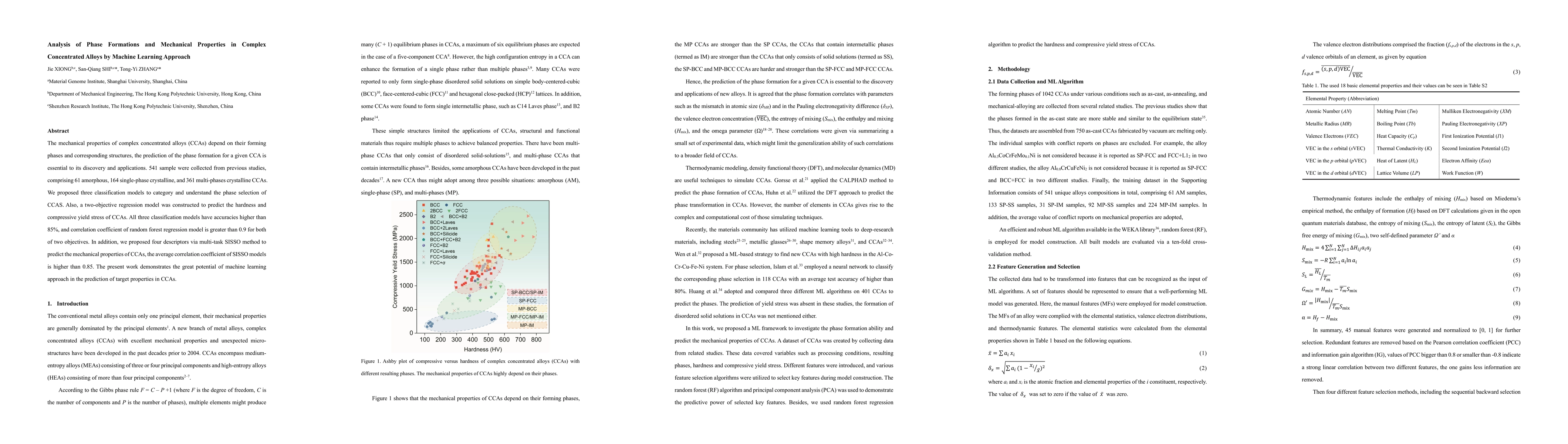A machine learning approach was used to analyze phase formations and mechanical properties in complex concentrated alloys, achieving accuracies over 85% and correlation coefficients above 0.9 for hardness and compressive yield stress predictions.