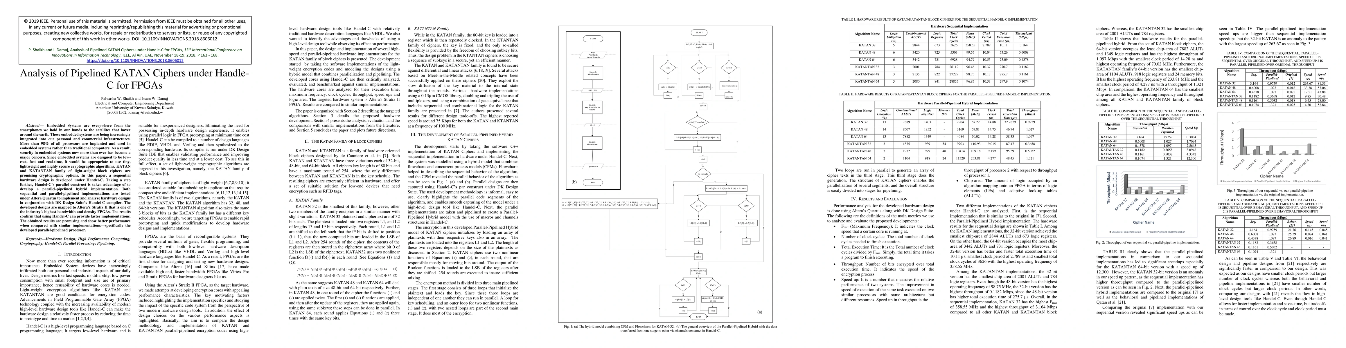 Researchers developed a parallel-pipelined implementation of lightweight KATAN ciphers on FPGAs using Handel-C, achieving faster performance compared to sequential implementations.
