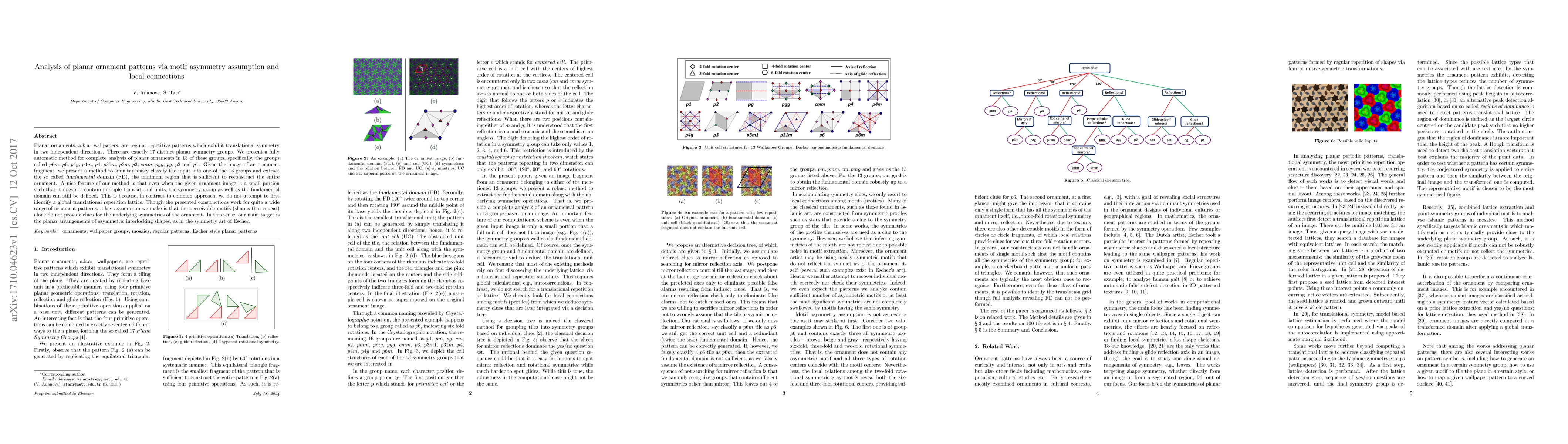 Researchers developed a method to automatically analyze planar ornament patterns in 13 distinct symmetry groups, extracting fundamental domains and classifying symmetries from fragment images without requiring global translational repetition lattices.
