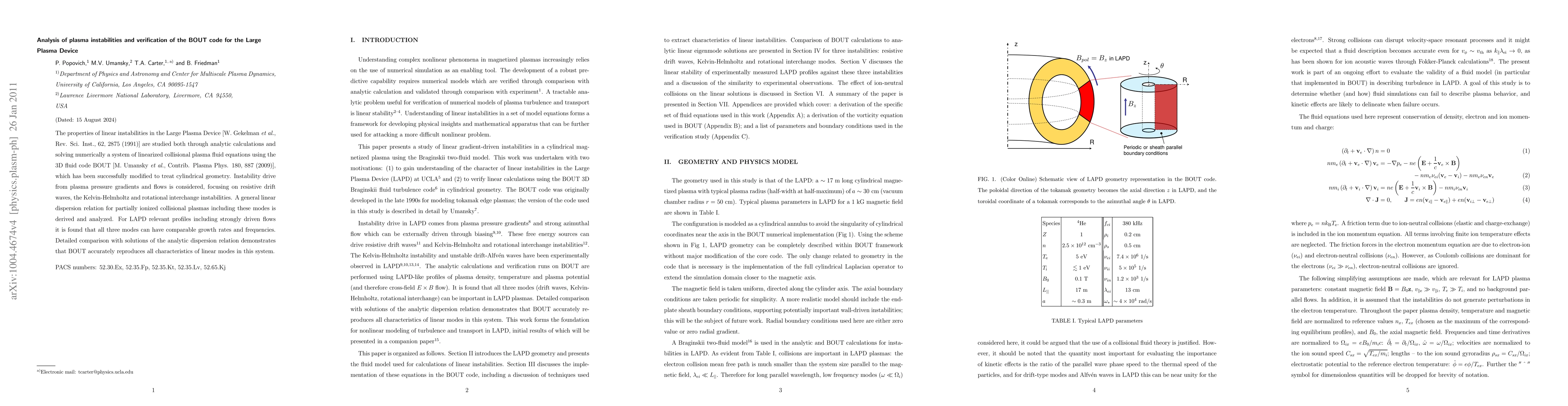 The properties of linear instabilities in the Large Plasma Device [W. Gekelman et al., Rev. Sci. Inst., 62, 2875 (1991)] are studied both through analytic calculations and solving numerically a system of linearized collisional plasma fluid equations using the 3D fluid code BOUT [M. Umansky et al., Contrib. Plasma Phys. 180, 887 (2009)], which has been successfully modified to treat cylindrical geometry. Instability drive from plasma pressure gradients and flows is considered, focusing on resistive drift waves, the Kelvin-Helmholtz and rotational interchange instabilities. A general linear dispersion relation for partially ionized collisional plasmas including these modes is derived and analyzed. For LAPD relevant profiles including strongly driven flows it is found that all three modes can have comparable growth rates and frequencies. Detailed comparison with solutions of the analytic dispersion relation demonstrates that BOUT accurately reproduces all characteristics of linear modes in this system.