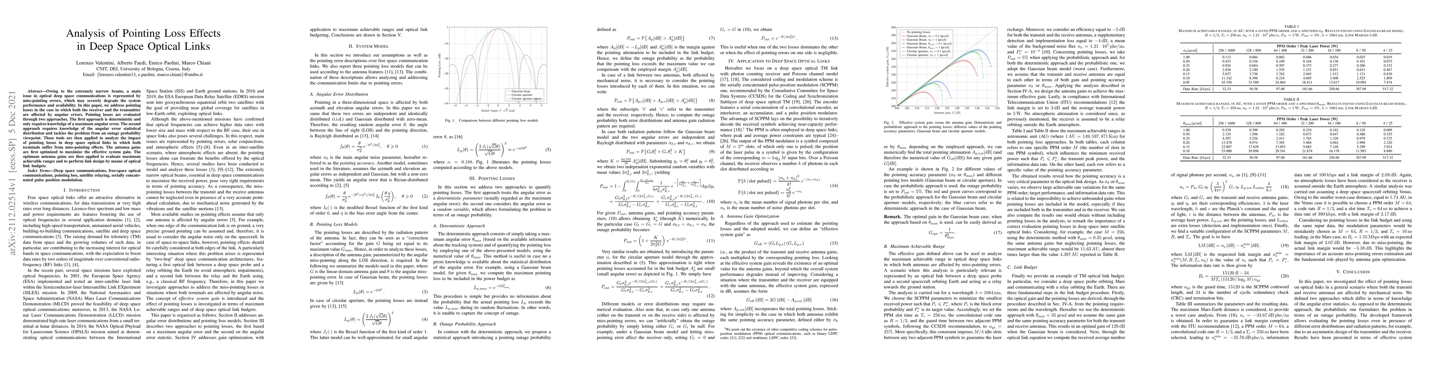 This paper analyzes the impact of pointing losses in deep space optical links, where both transmitter and receiver experience angular errors. It evaluates pointing losses using deterministic and statistical approaches, optimizes antenna gains to maximize system gain, and assesses maximum achievable ranges and link design via optical link budgets.