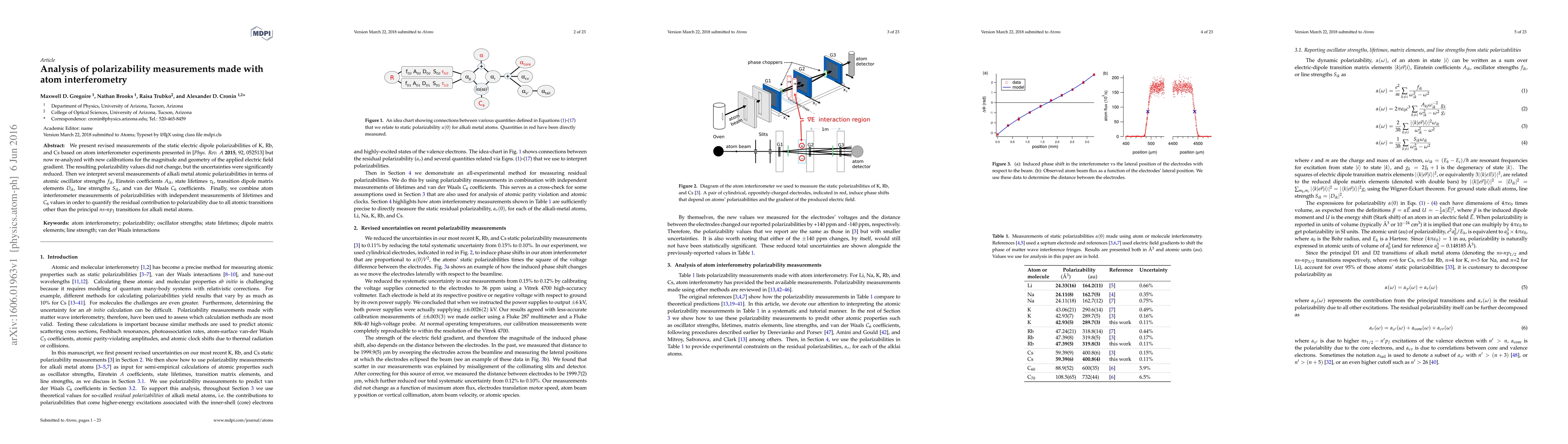 We present revised measurements of the static electric dipole polarizabilities of K, Rb, and Cs based on atom interferometer experiments presented in [Phys. Rev. A 2015, 92, 052513] but now re-analyzed with new calibrations for the magnitude and geometry of the applied electric field gradient. The resulting polarizability values did not change, but the uncertainties were significantly reduced. Then we interpret several measurements of alkali metal atomic polarizabilities in terms of atomic oscillator strengths $f_{ik}$, Einstein coefficients $A_{ik}$, state lifetimes $\tau_{k}$, transition dipole matrix elements $D_{ik}$, line strengths $S_{ik}$, and van der Waals $C_6$ coefficients. Finally, we combine atom interferometer measurements of polarizabilities with independent measurements of lifetimes and $C_6$ values in order to quantify the residual contribution to polarizability due to all atomic transitions other than the principal $ns$-$np_J$ transitions for alkali metal atoms.