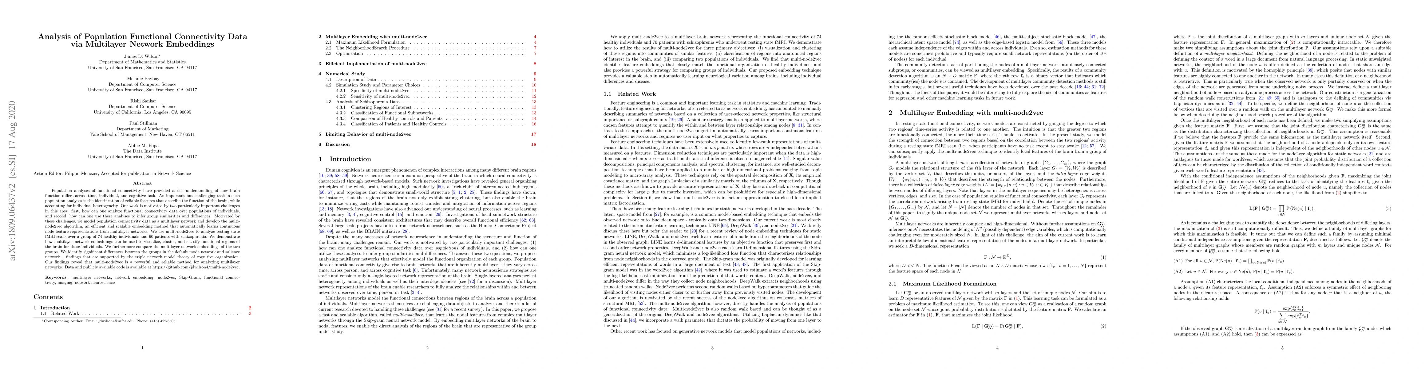 This paper develops the multi-node2vec algorithm to analyze functional connectivity data across populations using multilayer network embeddings, demonstrating its effectiveness in identifying group differences in resting state fMRI scans of healthy individuals and schizophrenia patients. The study highlights significant network differences in the default mode and salience networks, supporting cognitive organization theories.