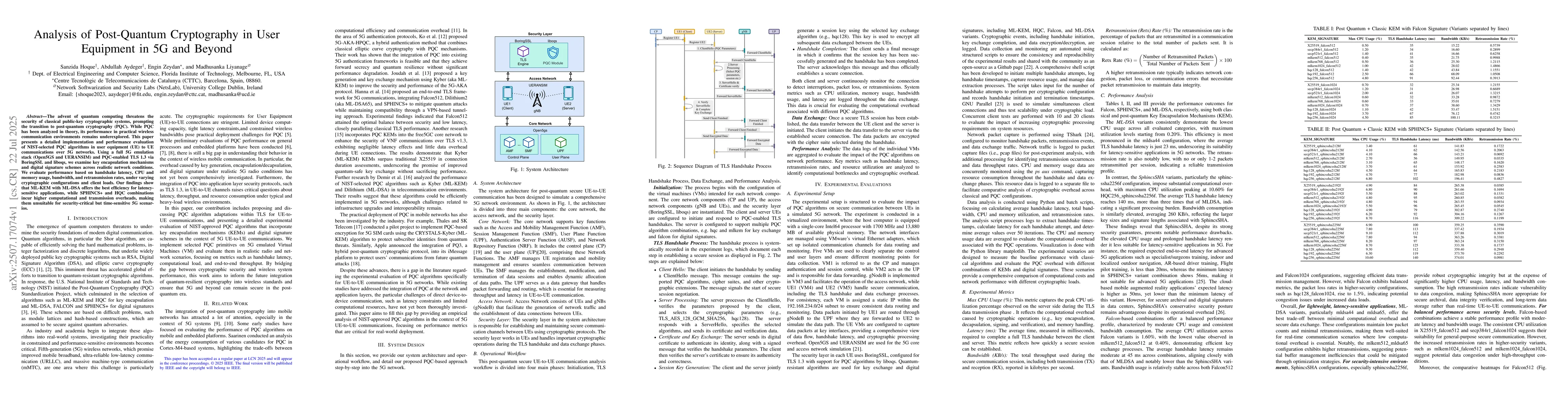 The paper presents a detailed implementation and performance evaluation of NIST-selected PQC algorithms in UE-to-UE communications over 5G networks using a full 5G emulation stack (Open5GS and UERANSIM) and PQC-enabled TLS 1.3 via BoringSSL and liboqs.