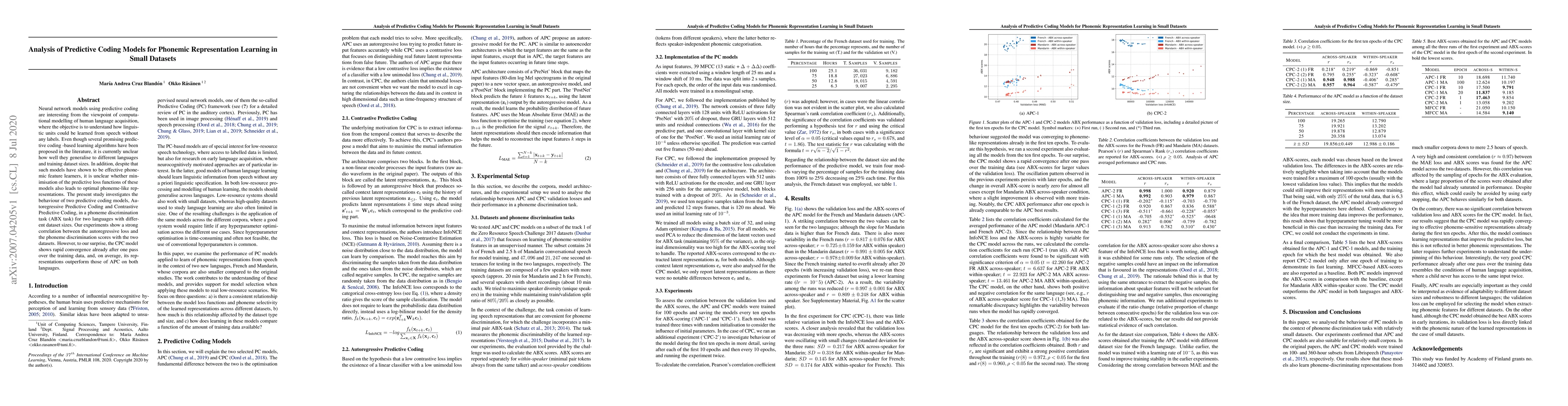 Neural network models using predictive coding are interesting from the viewpoint of computational modelling of human language acquisition, where the objective is to understand how linguistic units could be learned from speech without any labels. Even though several promising predictive coding -based learning algorithms have been proposed in the literature, it is currently unclear how well they generalise to different languages and training dataset sizes. In addition, despite that such models have shown to be effective phonemic feature learners, it is unclear whether minimisation of the predictive loss functions of these models also leads to optimal phoneme-like representations. The present study investigates the behaviour of two predictive coding models, Autoregressive Predictive Coding and Contrastive Predictive Coding, in a phoneme discrimination task (ABX task) for two languages with different dataset sizes. Our experiments show a strong correlation between the autoregressive loss and the phoneme discrimination scores with the two datasets. However, to our surprise, the CPC model shows rapid convergence already after one pass over the training data, and, on average, its representations outperform those of APC on both languages.