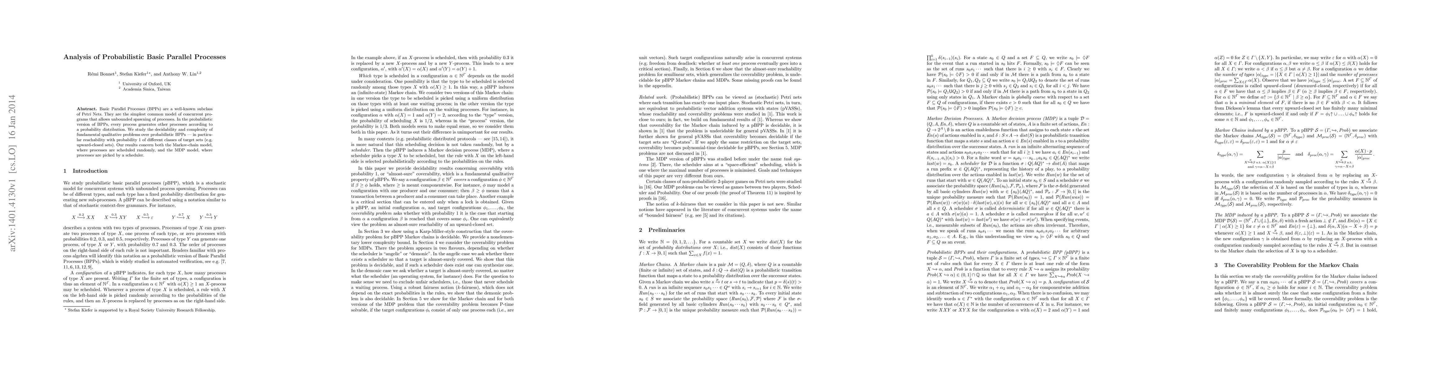 This paper investigates the decidability and complexity of reachability problems in probabilistic Basic Parallel Processes (BPPs), focusing on whether target sets can be reached with probability 1. It examines both Markov-chain and MDP models to understand scheduling impacts.